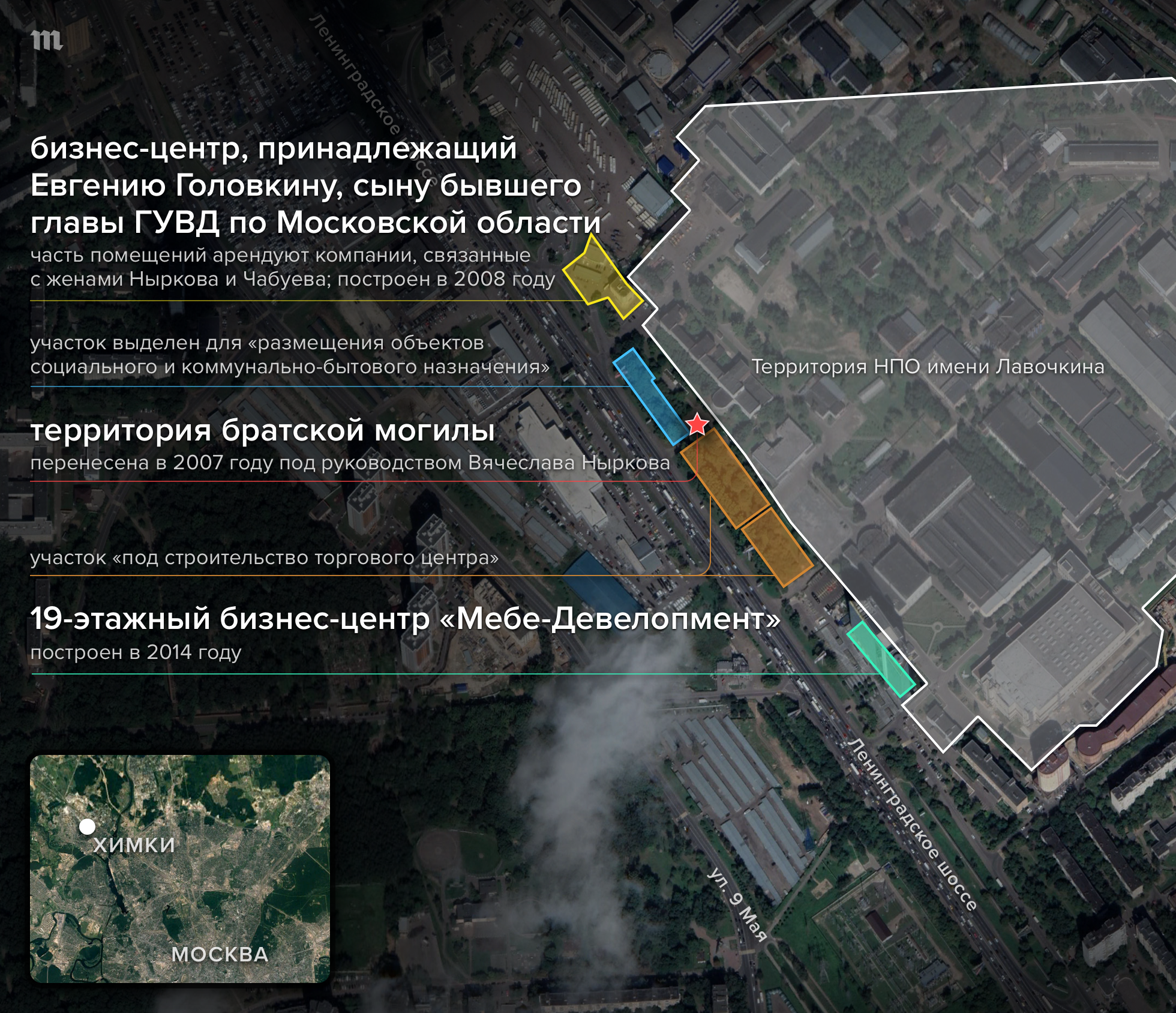 Сейчас на месте сквера, за который 12 лет назад боролся журналист, стоят бизнес-центры — после разразившегося скандала химкинские власти не решились застраивать его целиком (хотя в кадастровой карте земля уже была размежевана), ограничившись только придорожными участками. Спустя год после перезахоронения в нескольких сотнях метров от бывшей братской могилы построили офисный центр, принадлежащий Евгению Головкину — сыну тогдашнего начальника ГУВД Московской области (2001–2014) Николая Головкина. В бизнес-центр помимо прочих въехали компании, на тот момент принадлежавшие жене Вячеслава Ныркова — директора похоронной службы Химок и человека, который руководил работами по перезахоронению останков из братской могилы.