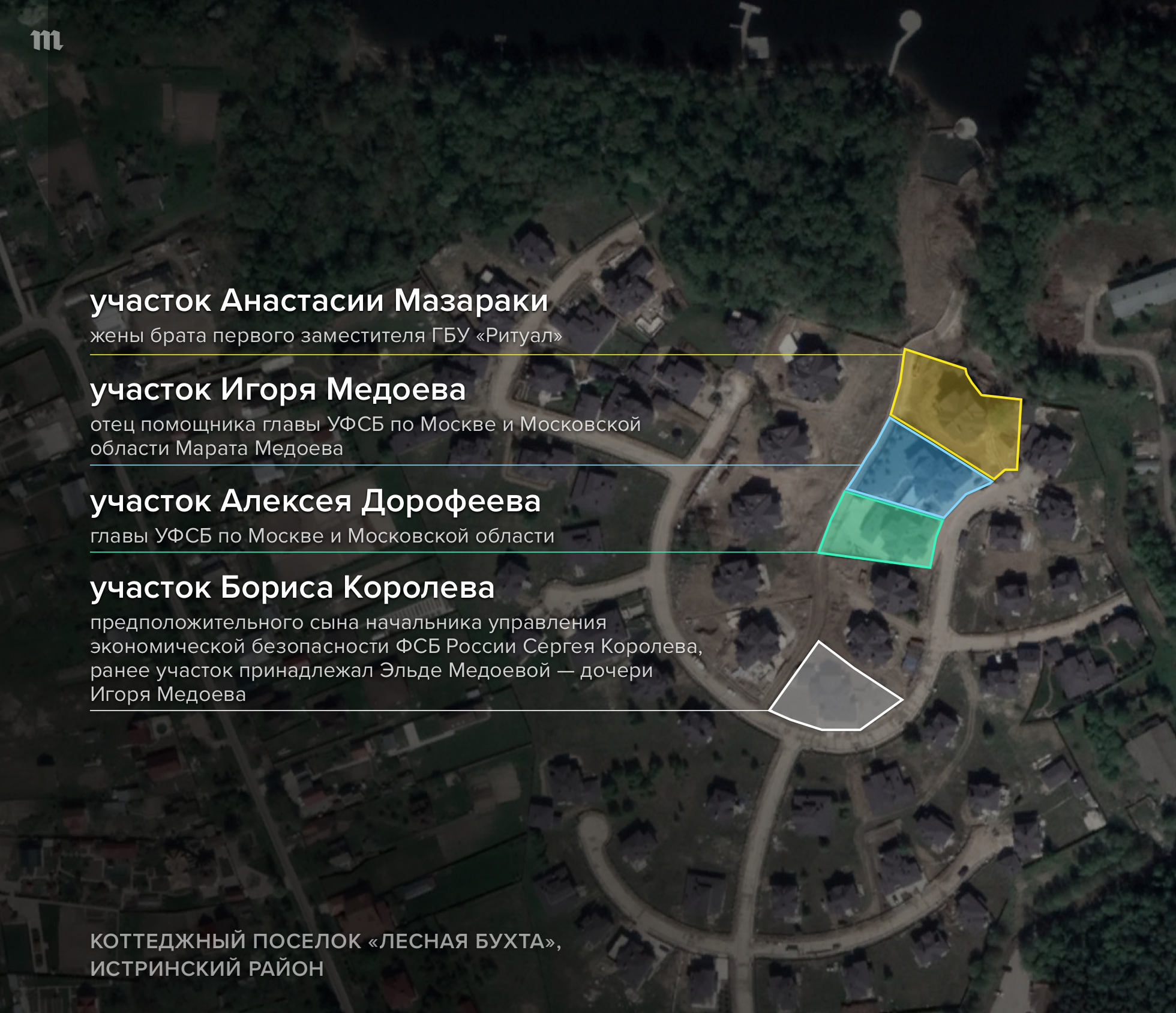 В 2015-м землю в «Лесной бухте» по соседству с Медоевым приобрел Алексей Дорофеев (сейчас в выписке указан собственник — «Российская Федерация»). Коттеджи Медоев и Дорофеев оформили на себя в один день в 2017 году. Как свидетельствует аэросъемка, проведенная «Новой газетой» в июне 2019-го, между участками Дорофеева и Медоева нет забора.