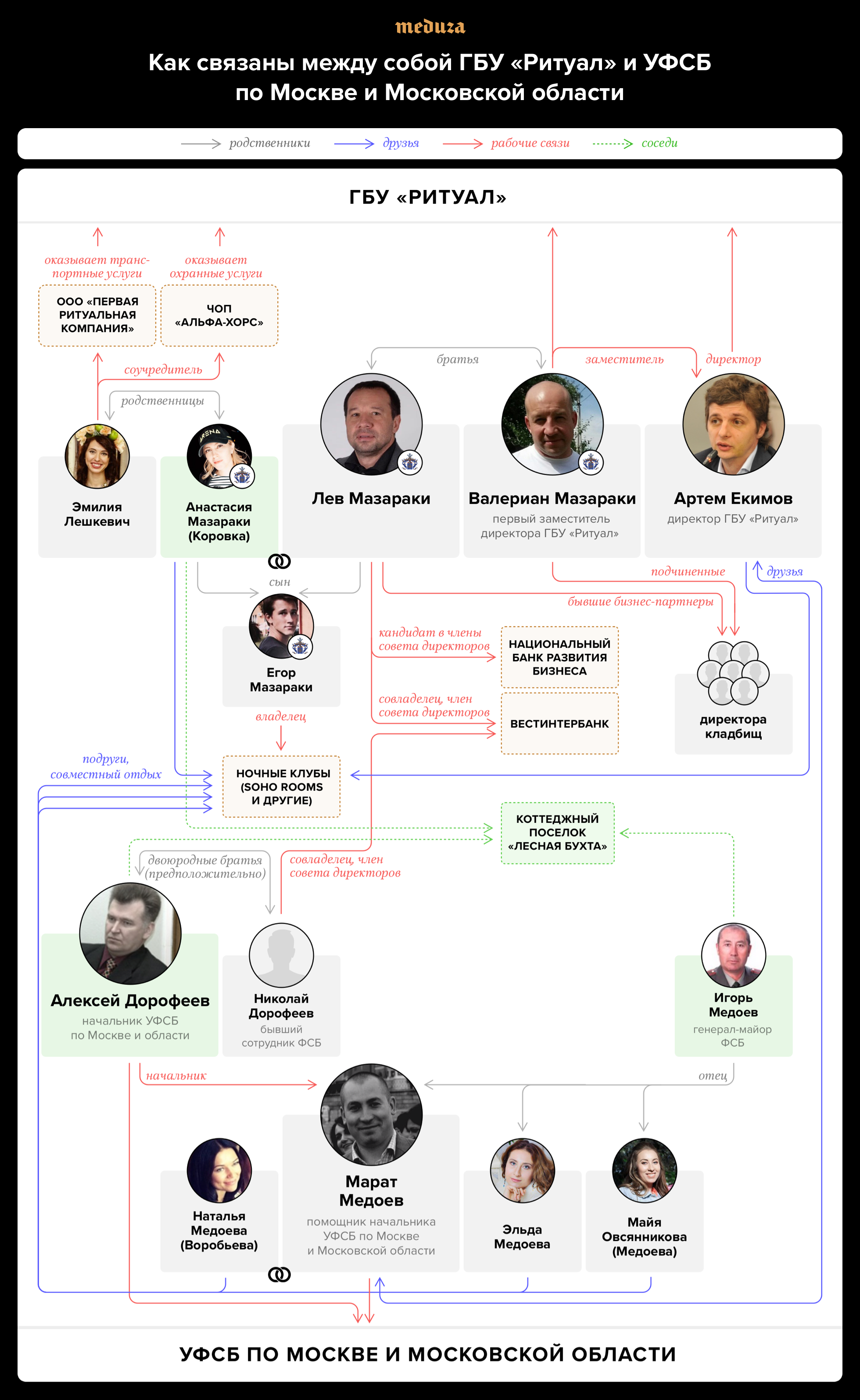 37-летний Марат Медоев (которого источник из окружения Сугробова называл другом Артема Екимова) — личный помощник Алексея Дорофеева. Медоев родился в Ленинграде, но как минимум с начала 2000-х годов живет в Москве, до 2012-го работал в следственном управлении ФСБ. Официально он никогда не занимался бизнесом, но привык покупать дорогие автомобили и мотоциклы. Так, в 2012-м он приобрел новый BMW X5 Drive, а двумя годами позже — мотоцикл BMW R1. Автомобиль, как писал основатель Фонда борьбы с коррупцией Алексей Навальный, Медоев затем продал Валерию Большакову; как выяснила «Медуза», Большаков — начальник отделения транспортного обслуживания ГБУ «Ритуал». Валерий Большаков отказался от комментариев и бросил трубку. Сын Большакова Александр заявил, что отец не знает Марата Медоева, а машину купил по объявлению. При этом Александр Большаков — близкий друг семей Медоевых и Мазараки и часто проводит досуг вместе с ними. Так, например, на свадьбе Большакова-младшего в клубе Soho Rooms присутствовал Валериан Мазараки и жена Марата Медоева Наталья.