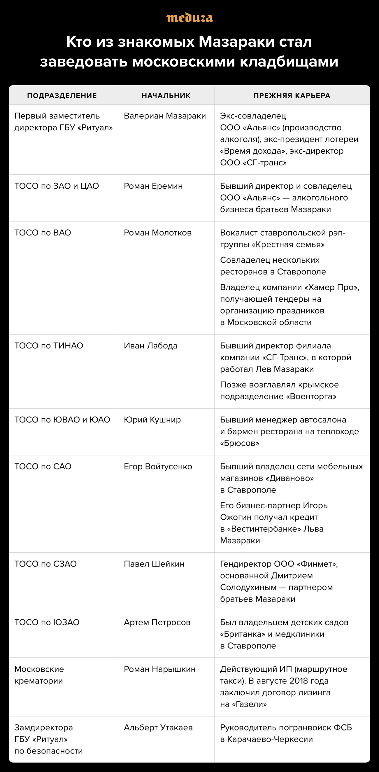 Дозвониться до Валериана и Льва Мазараки «Медузе» не удалось. Валериан не ответил на письмо, направленное на его имя через почту пресс-службы ГБУ «Ритуал». Лев не ответил на вопросы, отправленные ему в фейсбук.