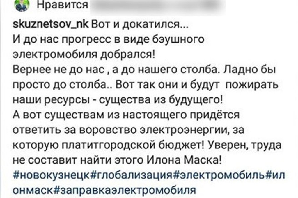 Недовольство мэра Новокузнецка Сергея Кузнецова вызвал электромобиль, подзаряжающийся от столба уличной электросети. Чиновник в своем инстаграм посчитал это воровством городской энергии и решил найти «этого Илона Маска». Через несколько часов пост был удален.