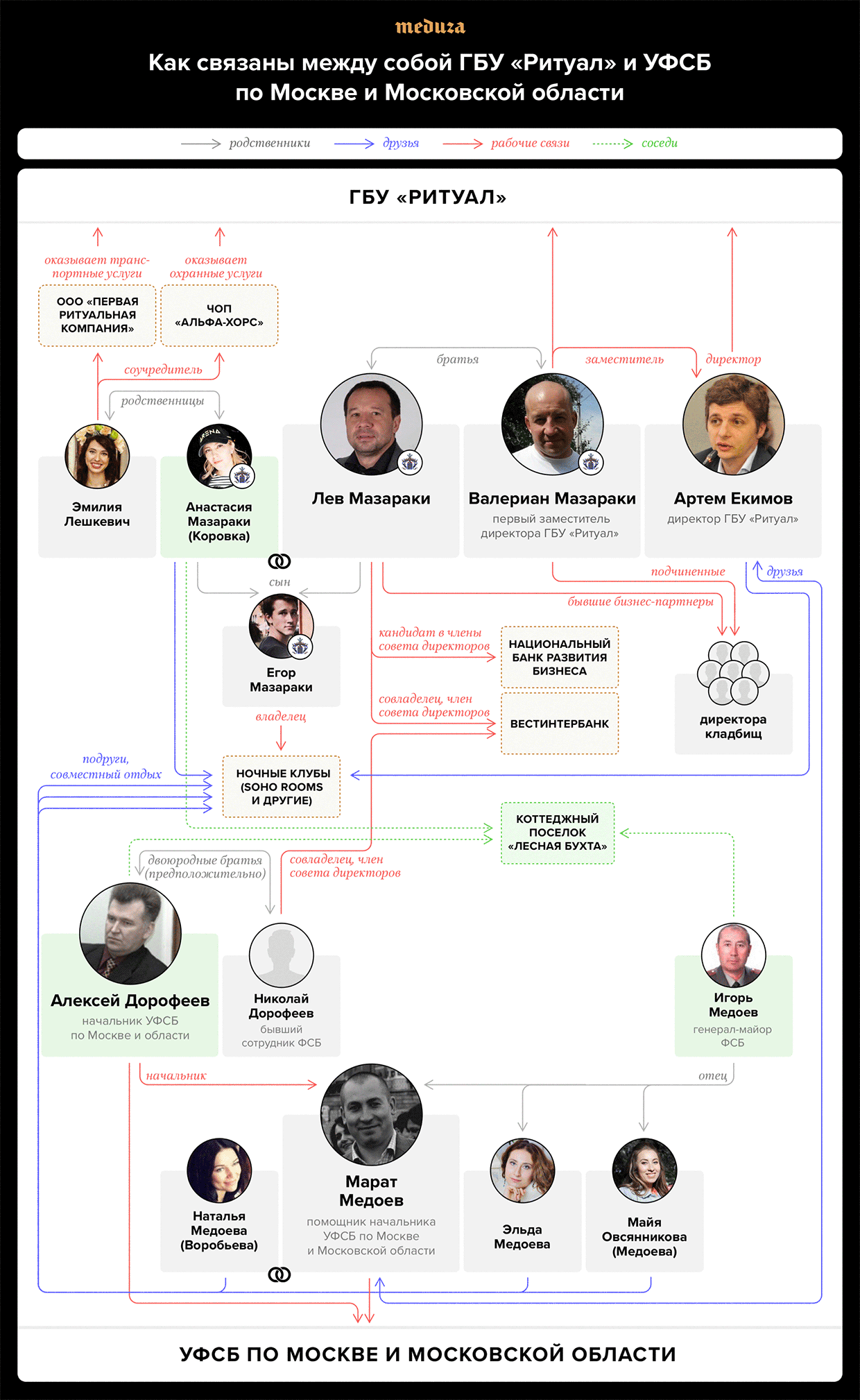 37-летний Марат Медоев (которого источник в окружении Сугробова называл другом Артема Екимова) — личный помощник Алексея Дорофеева. Медоев родился в Ленинграде, но как минимум с начала 2000-х годов живет в Москве, до 2012-го работал в следственном управлении ФСБ. Официально он никогда не занимался бизнесом, но привык покупать дорогие автомобили и мотоциклы. Так, в 2012-м он приобрел новый BMW X5 Drive, а двумя годами позже — мотоцикл BMW R1. Автомобиль, как писал основатель Фонда борьбы с коррупцией Алексей Навальный, Медоев затем продал Валерию Большакову; как выяснила «Медуза», Большаков — начальник отделения транспортного обслуживания ГБУ «Ритуал». Валерий Большаков отказался от комментариев и бросил трубку. Сын Большакова Александр заявил, что отец не знает Марата Медоева, а машину купил по объявлению. При этом Александр Большаков — близкий друг семей Медоевых и Мазараки и часто проводит досуг вместе с ними. Так, например, на свадьбе Большакова-младшего в клубе Soho Rooms присутствовал Валериан Мазараки и жена Марата Медоева Наталья.