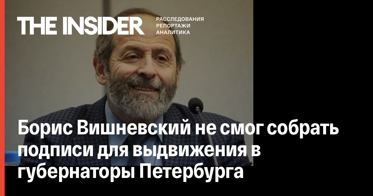 Лидер фракции «Яблоко» в петербургском заксобрании Борис Вишневский не смог собрать нужного количества подписей муниципальных депутатов для участия в губернаторских выборах, сообщает РБК.