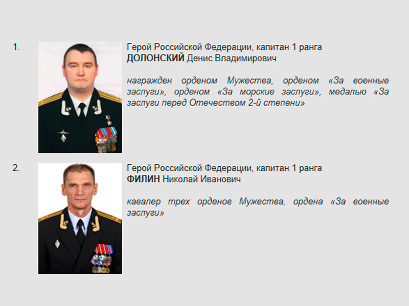 1. Герой Российской Федерации, капитан 1-го ранга Долонский Денис Владимирович; награжден орденом "Мужества", орденом "За военные заслуги", орденом "За морские заслуги", медалью "За заслуги перед отечеством II степени".