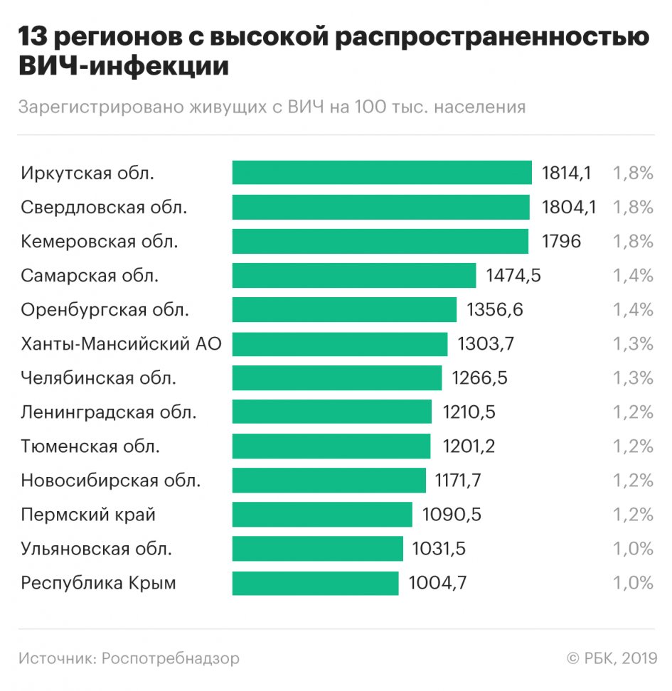 Согласно статистике, отправленной Роспотребнадзором в трёхстороннюю комиссию по регулированию социально-трудовых отношений, в 35 российских регионах доля населения с ВИЧ превышает 0,5% в общем объёме жителей каждого региона.