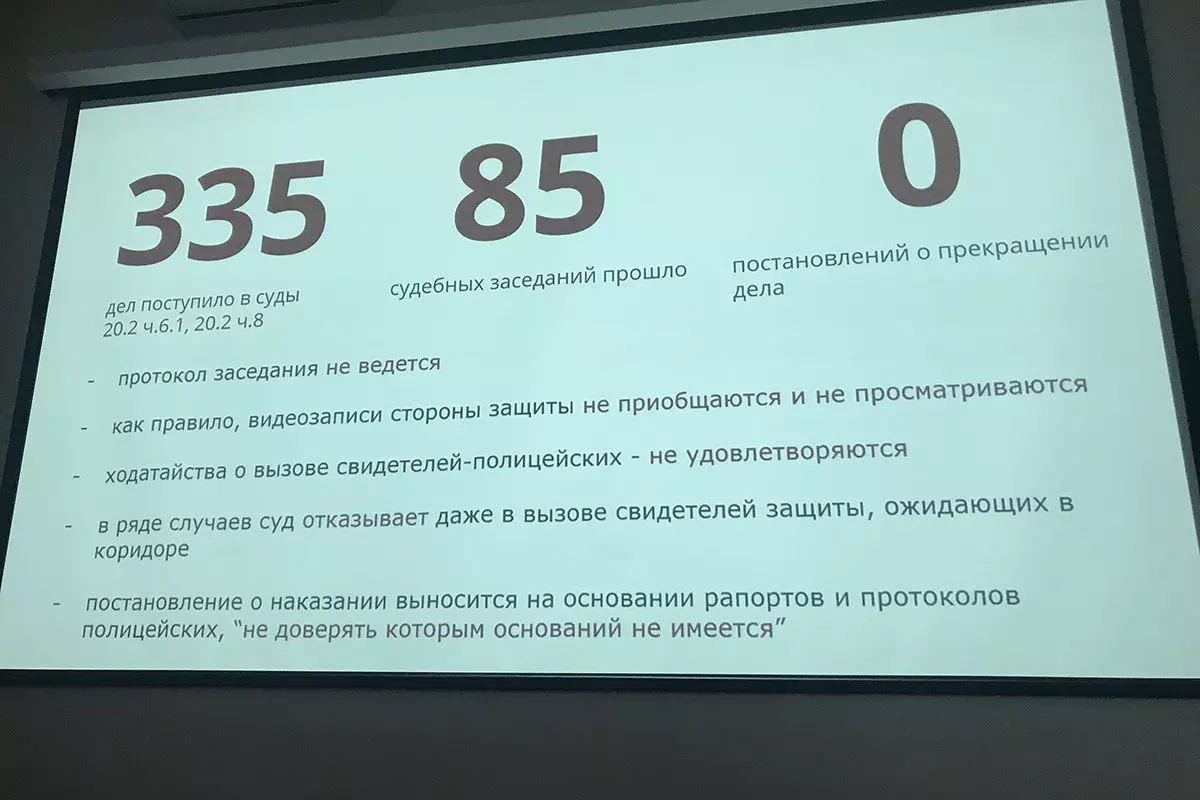 Как сказала правозащитница, многие заседания прошли без привлекаемых лиц, поскольку им даже не сообщали о рассмотрении дела. По ее словам, как правило протокол на заседаниях не ведется, видеозаписи защиты не приобщаются и не рассматриваются, ходатайства о вызове свидетелей-полицейских не удовлетворяются, а постановление о наказании выносится на основании рапортов полицейских, «не доверять которым оснований не имеется».
