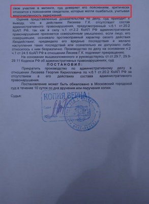 Дела по части 6.1 статьи 20.2 КоАП судья прекратила в связи с отсутствием состава правонарушения. В постановлениях указано, что «суд… критически относится к пояснениям свидетел<ей>, которые могли ошибаться, учитывая многочисленность задержаний».