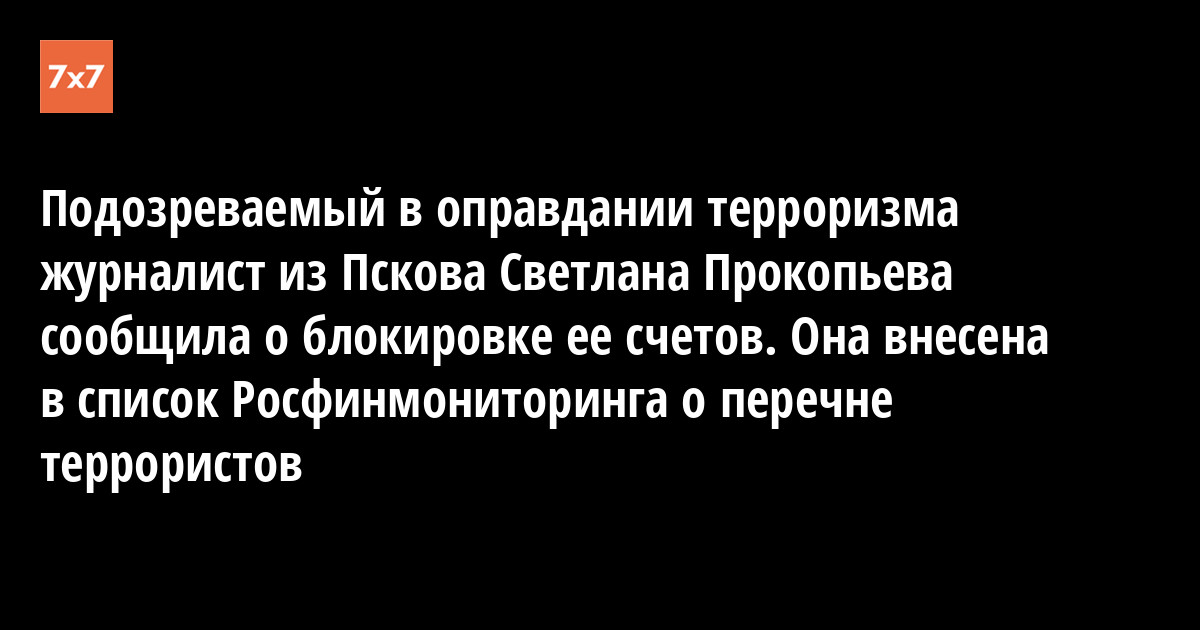 Подозреваемый в оправдании терроризма журналист из Пскова Светлана Прокопьева сообщила о блокировке ее счетов. Она внесена в список Росфинмониторинга о перечне террористов