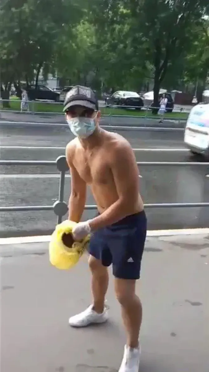 На видео, снятом сборщиком, двое молодых людей. Рассмотреть можно только одного: молодой, накачанный (он гол по пояс), в кепке и медицинской маске. Руки в перчатках, держит желтый пакет.