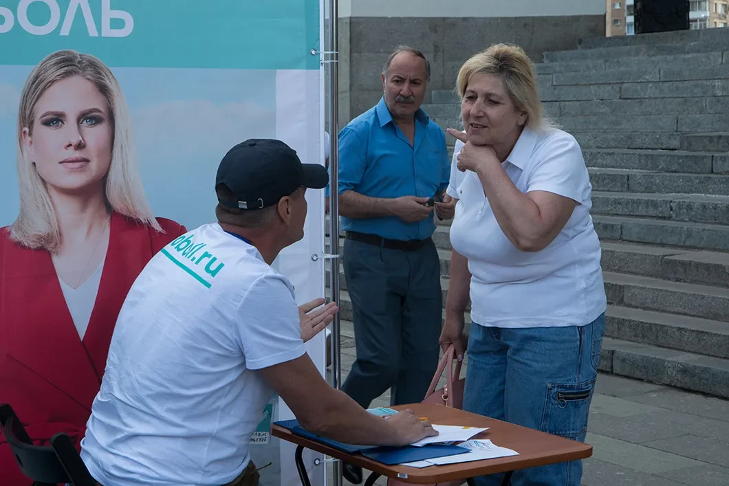 На призыв отдать голос против «Единой России» реагируют по-разному. Мимо куба медленно идет совсем пожилая женщина. Ее глаз цепляют лозунги на кубе Соболь. Внимательно прочитав их, она подходит к волонтеру Вадиму, тихо беседует с ним и ставит подпись.