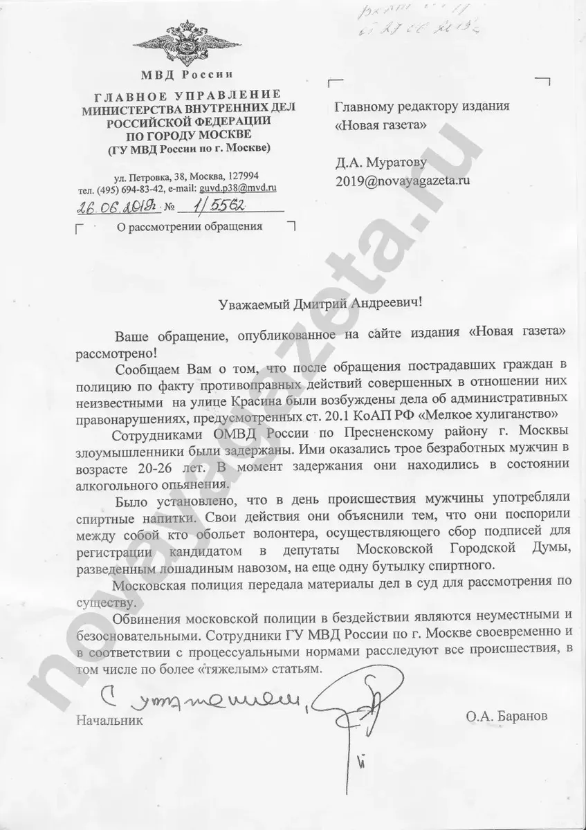 Спустя 5 дней после нападения МВД сообщило о трех мужчинах 20–26 лет, задержанных по подозрению в мелком хулиганстве (ст. 20.1 КоАП) на улице Красина, рядом с Тишинской площадью. В ответе на обращение Дмитрия Муратова глава московской полиции Олег Баранов пишет, что