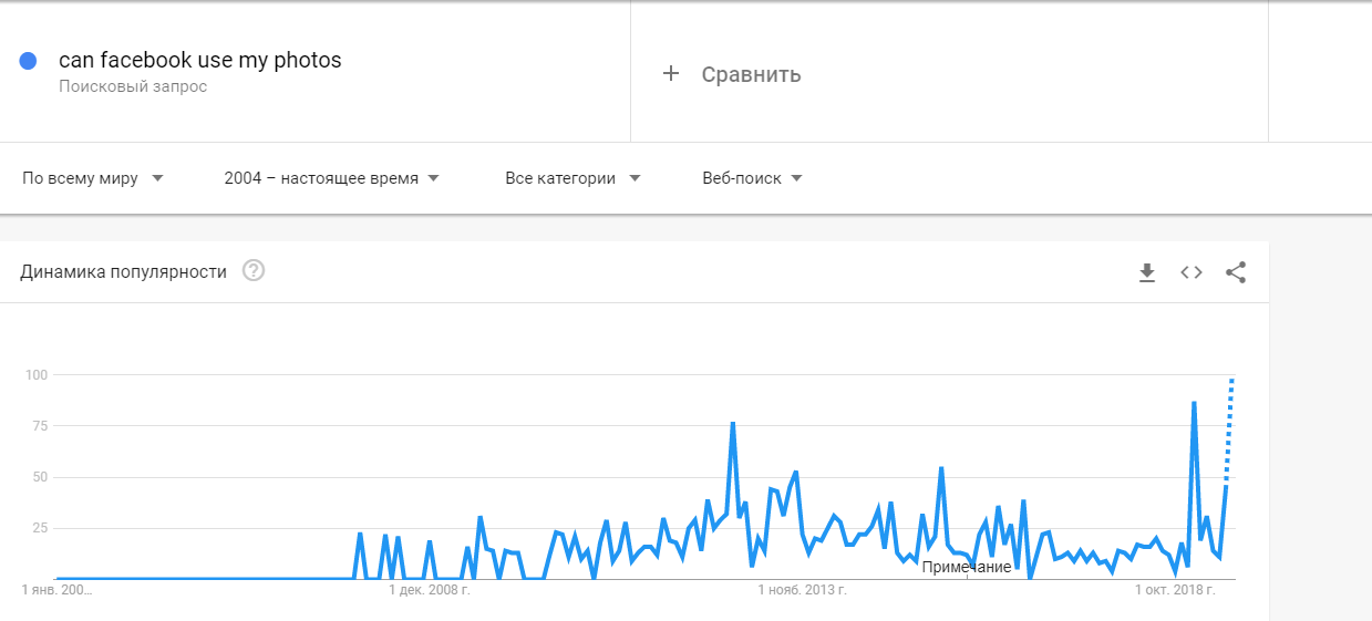 - Из статистики запросов в Google «может ли Facebook использовать мои фотографии» видно, что распространение фейка достигало пиков в начале 2008 года, осенью 2009-го, в декабре 2012-го, осенью 2015-го. Последний и самый крупный пик — сейчас.