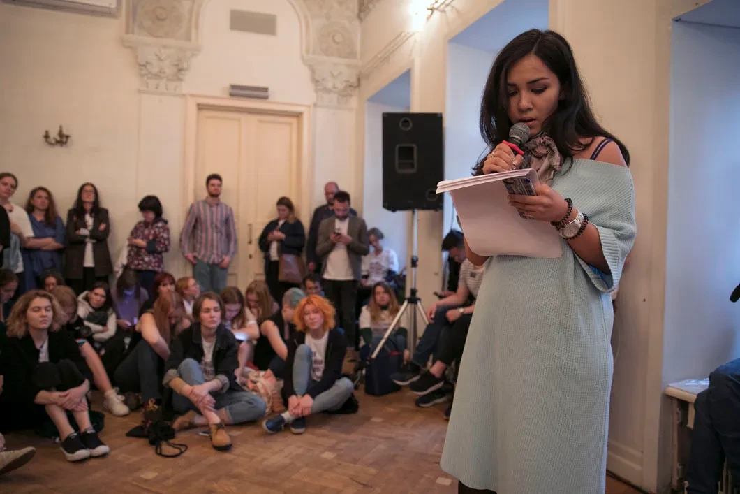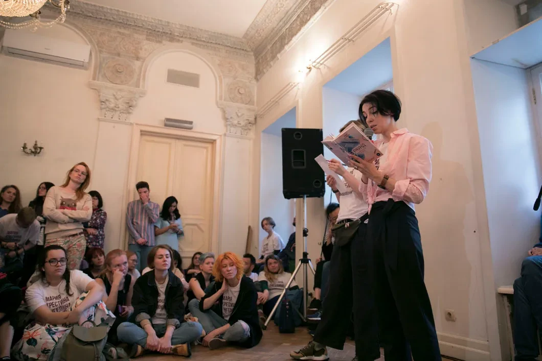 5 июля, клуб Avangarden 2.0, старый особнячок в Замоскворечье. Лепнина и люстры отреставрированы, а стульев нет вовсе: сидят на полу, на куртках и рюкзачках, стоят по стенам душ 150–200. Читают поэтессы, прозаики, журналисты, драматурги: звучат все женские голоса. Публика — обоих полов. В основном 20–30-летняя.
