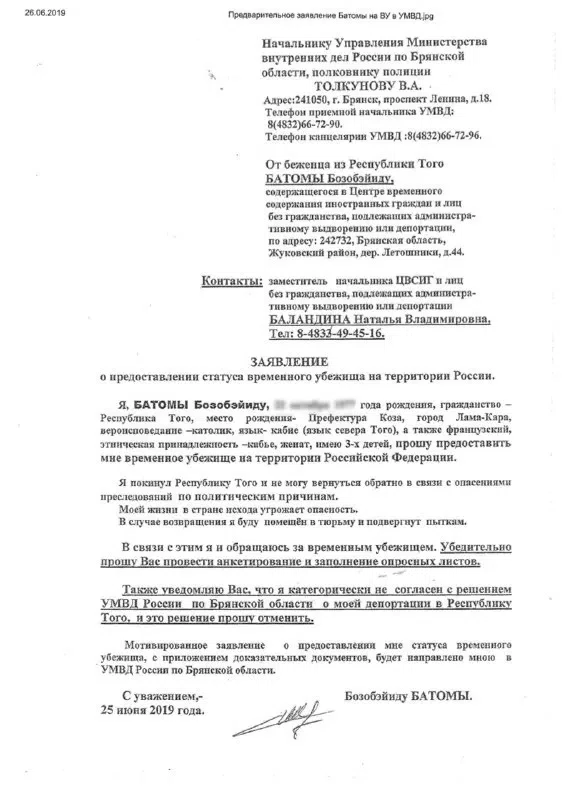 В комитете «Гражданское содействие» эту информацию опровергают. В распоряжении «Новой» есть заявление Батомы от 25 июня 2019 года на имя начальника УМВД по Брянской области Владислава Толкунова, в котором он просит об убежище, поскольку в Того его жизни угрожает опасность.