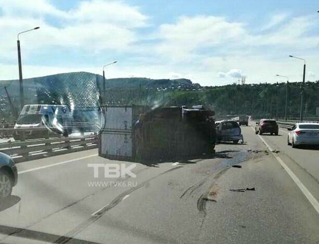 В Красноярске на 4 мосту фура врезалась в Toyota: есть пострадавшие