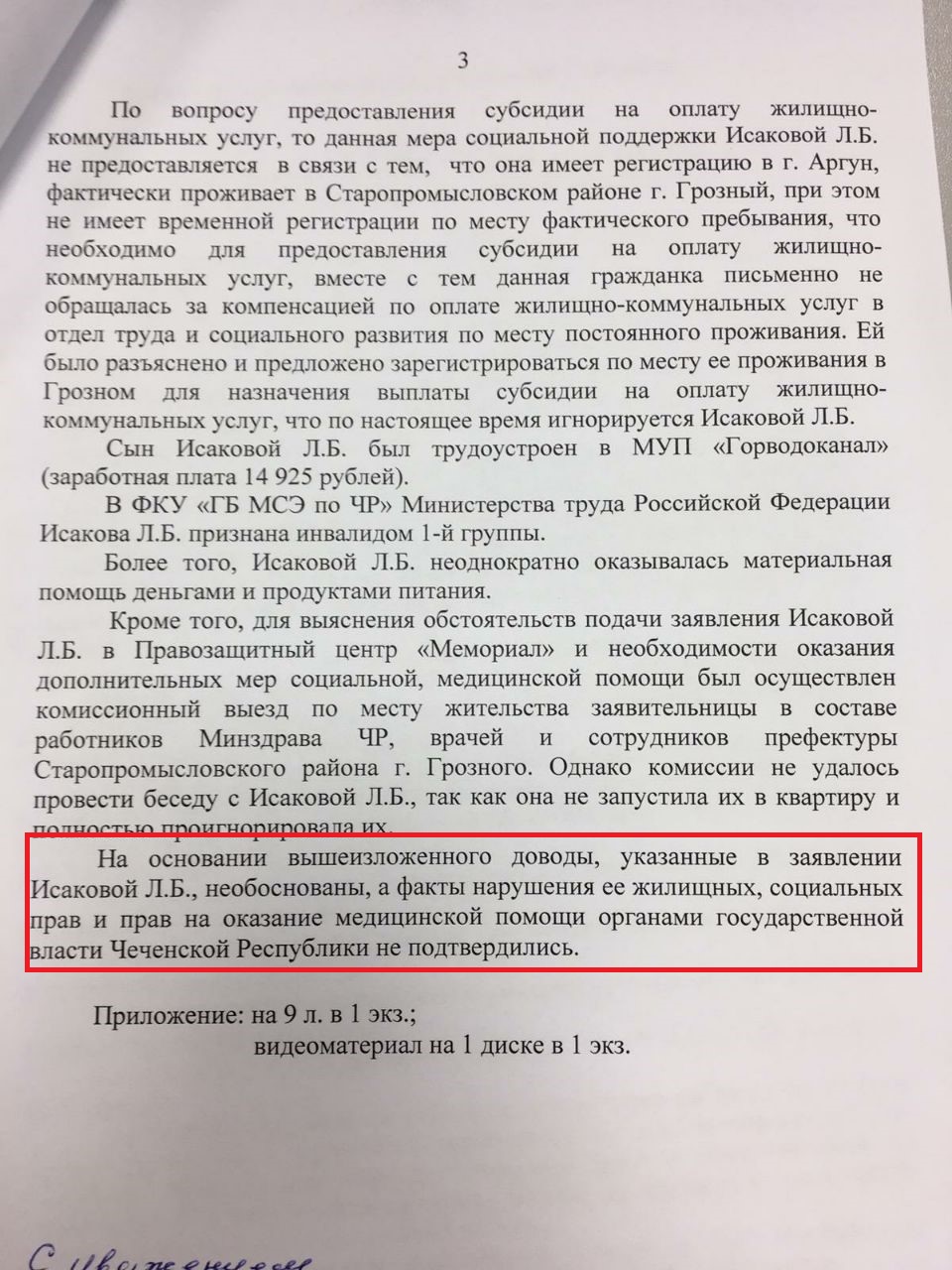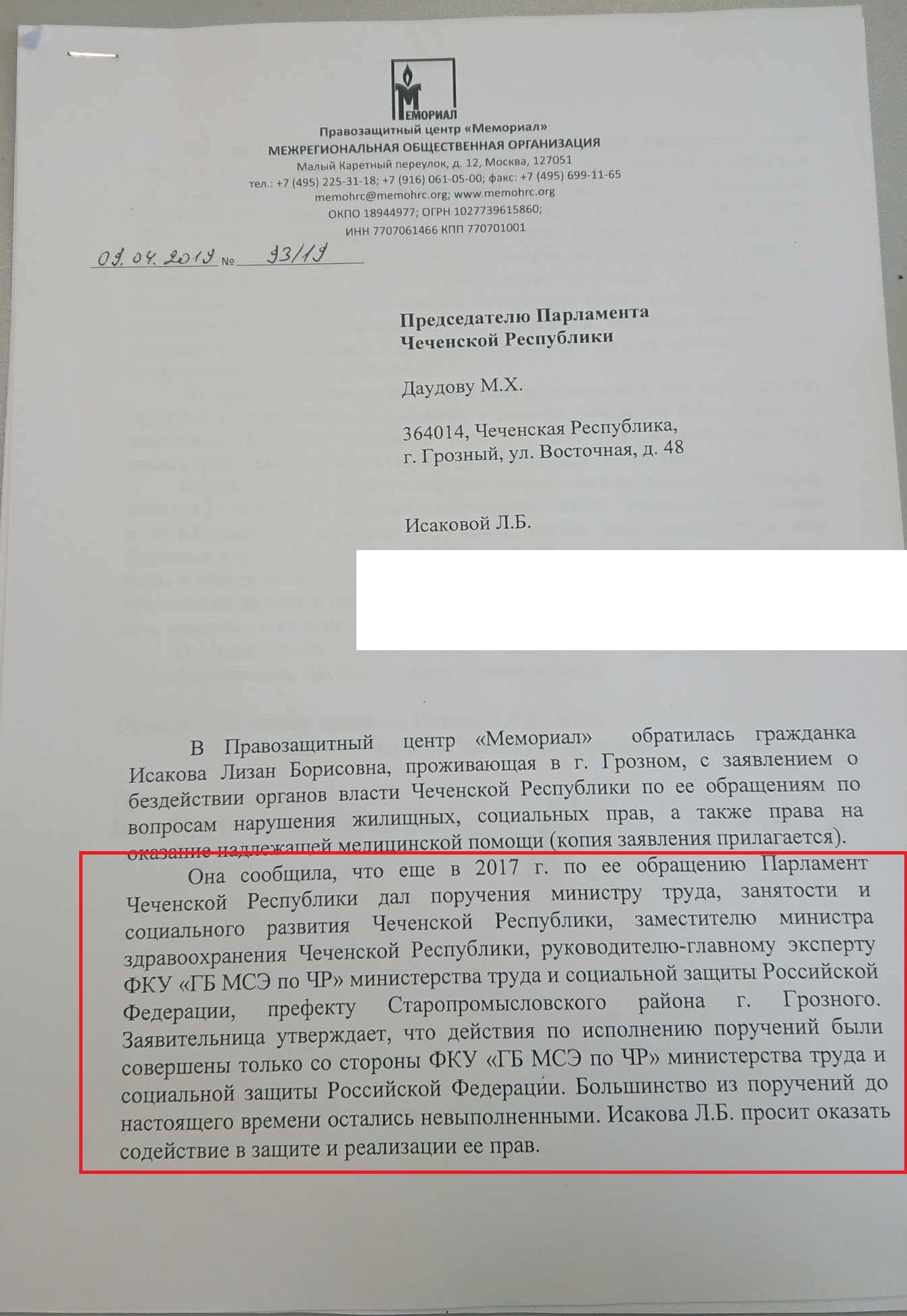 В апреле 2019 года Исакова обратилась в "Мемориал" – правозащитники напомнили Даудову о невыполненном обещании двухлетней давности. В ответе (имеется в распоряжении "Кавказ.Реалии") чеченские власти говорят о комиссии Минздрава, которую специально собрали "по вопросу нарушения прав на охрану здоровья пациентки Исаковой Л.Б.".