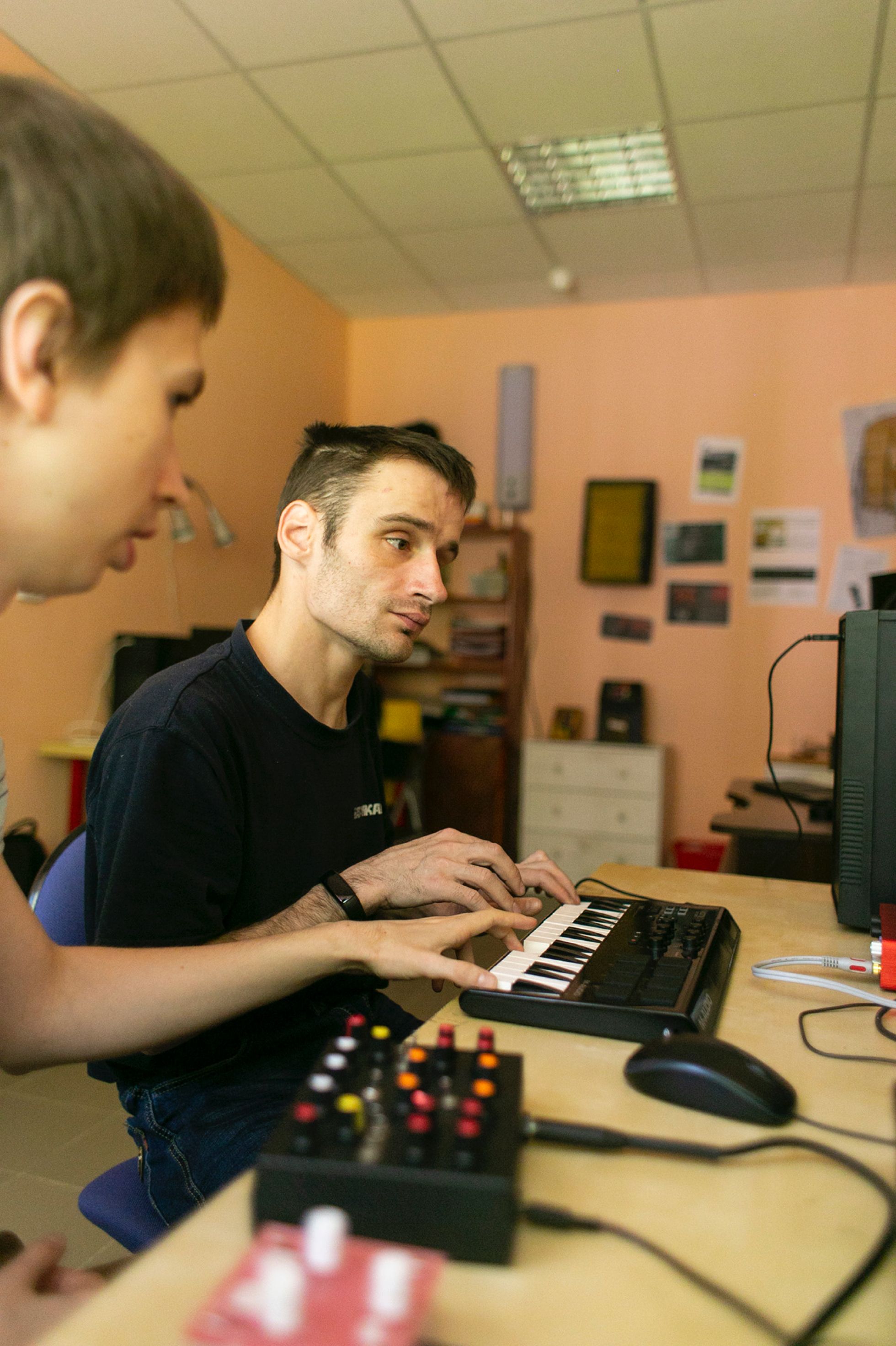 — Несколько обычных стационарных компьютеров, несколько специальных приборов. Например, клавиатура с большими кнопками и панелью, на которую можно опереться. Специального музыкального оборудования нет, но я нахожу подходящие устройства. Например, MIDI-контроллер, выдерживающий сильные удары, — для ребят, которые не могут рассчитать силу движений. На покупку всего этого у «Перспектив» заложен бюджет. Если нужно купить что-то особенное — обращаемся к фандрайзингу.