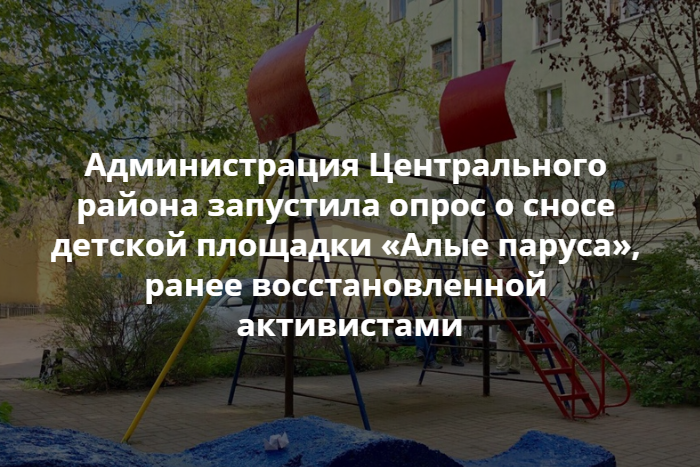 Администрация Центрального района опубликовала во «ВКонтакте» опрос о сносе детской площадки «Алые паруса», расположенной на Тверской улице в Петербурге.