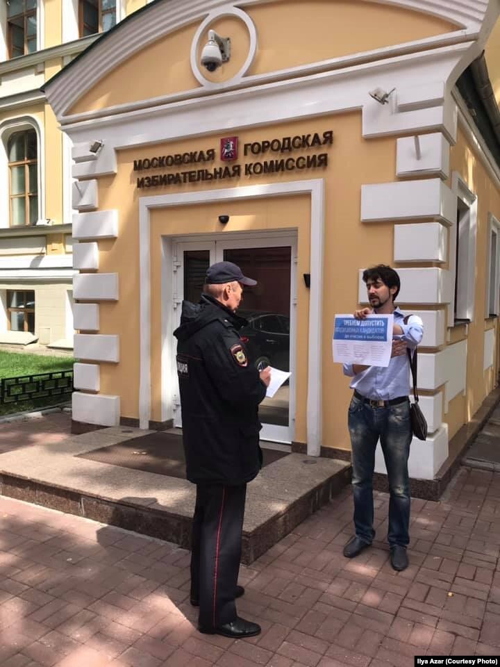 Около здания Московской городской избирательной комиссии в центре города началась серия одиночных пикетов в поддержку регистрации независимых кандидатов на выборы в Мосгордуму. Об этом в своём фейсбуке сообщил муниципальный депутат Илья Азар.