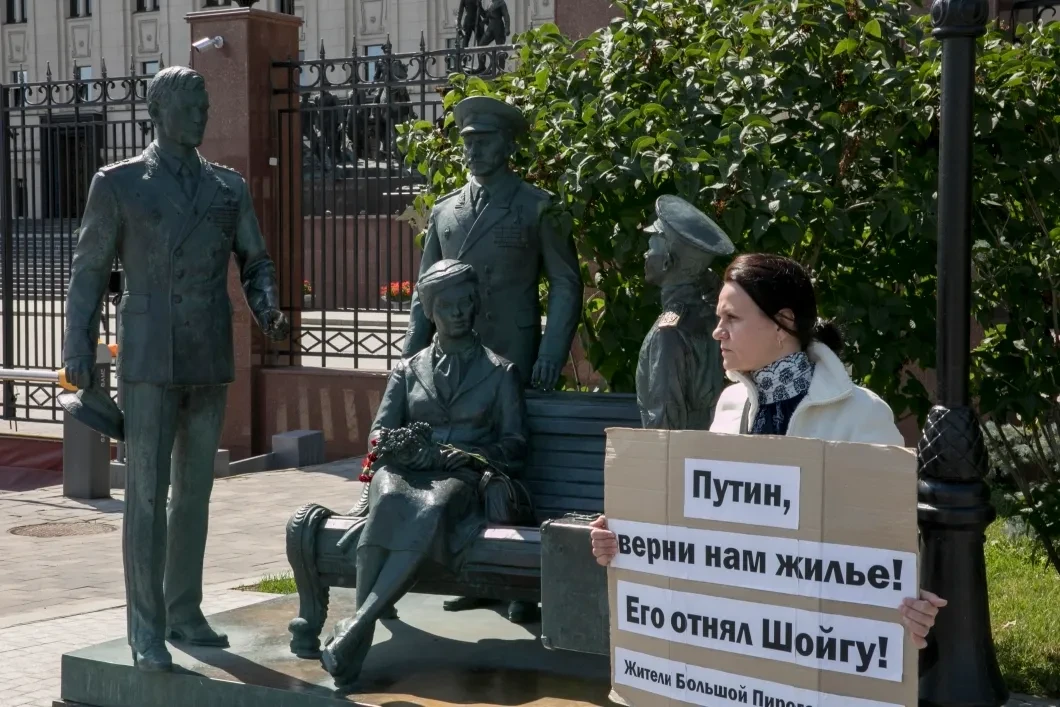 «Путин, верни нам жилье! Его отнял Шойгу!» — с таким плакатом к Минобороны вышла на одиночный пикет 47-летняя бывшая жена военнослужащего Елена Волкова. В общежитие она заехала по трудовому договору в 2000 году вместе с двумя маленькими сыновьями и мужем, поступившим в Военный университет для повышения квалификации. Елена устроилась в тот же вуз лаборантом на кафедру информатики и управления.