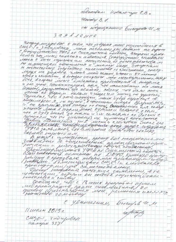 По словам Быстрова, сотрудники Сахалинского УФСБ регулярно навещающие его в СИЗО, угрожают держать его в камере сколько угодно долго, пока он не даст показания на лиц, которые, утверждает бывший зампред правительства, "к поводу задержания отношения не имеют".