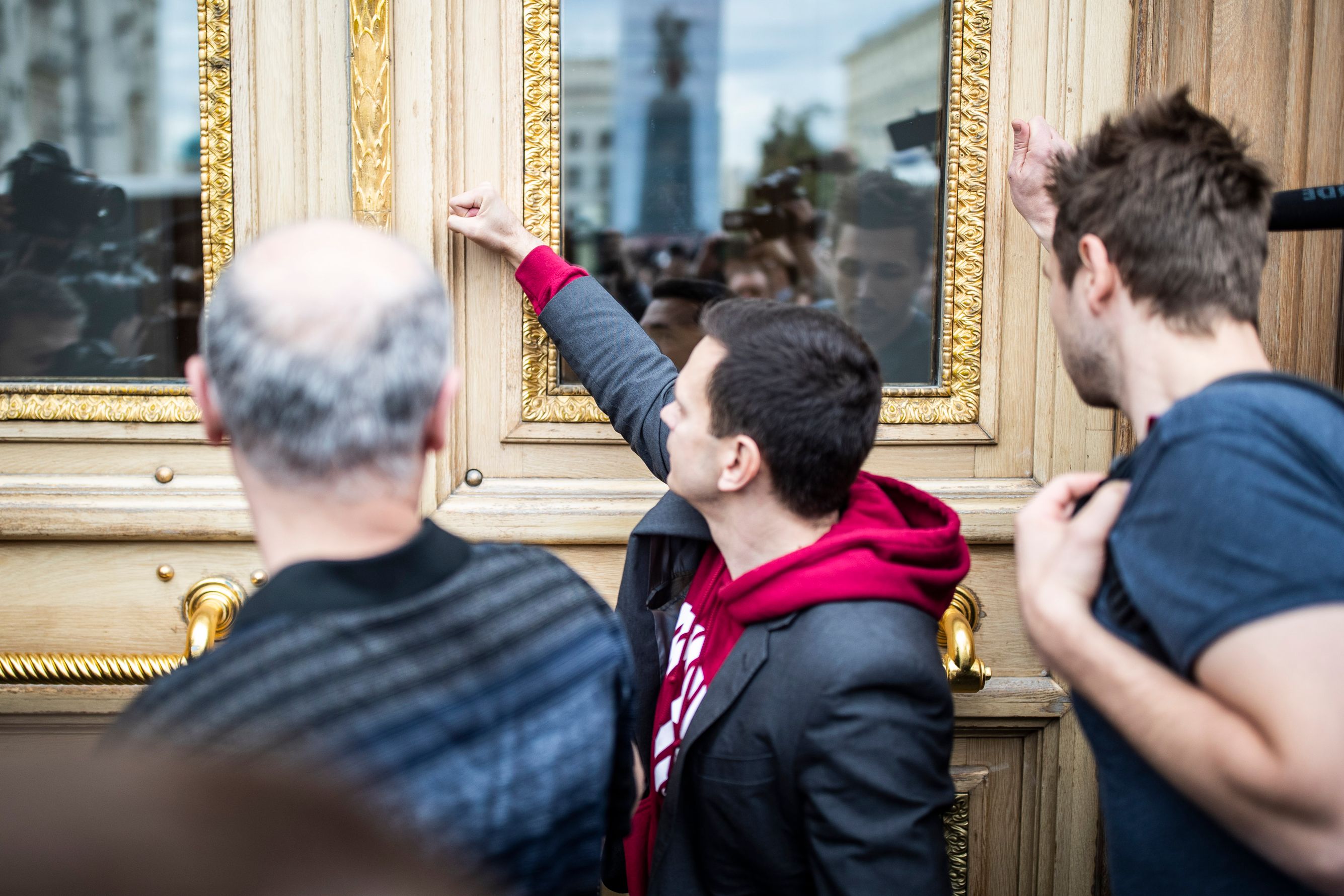 Полицейские разрешили Яшину пройти внутрь и передать требования протестующих — но в МГИКе ему не открыли. По телефону помощник Горбунова сказал, что тот на даче. Толпа скандирует: «Мы важнее картошки!»
