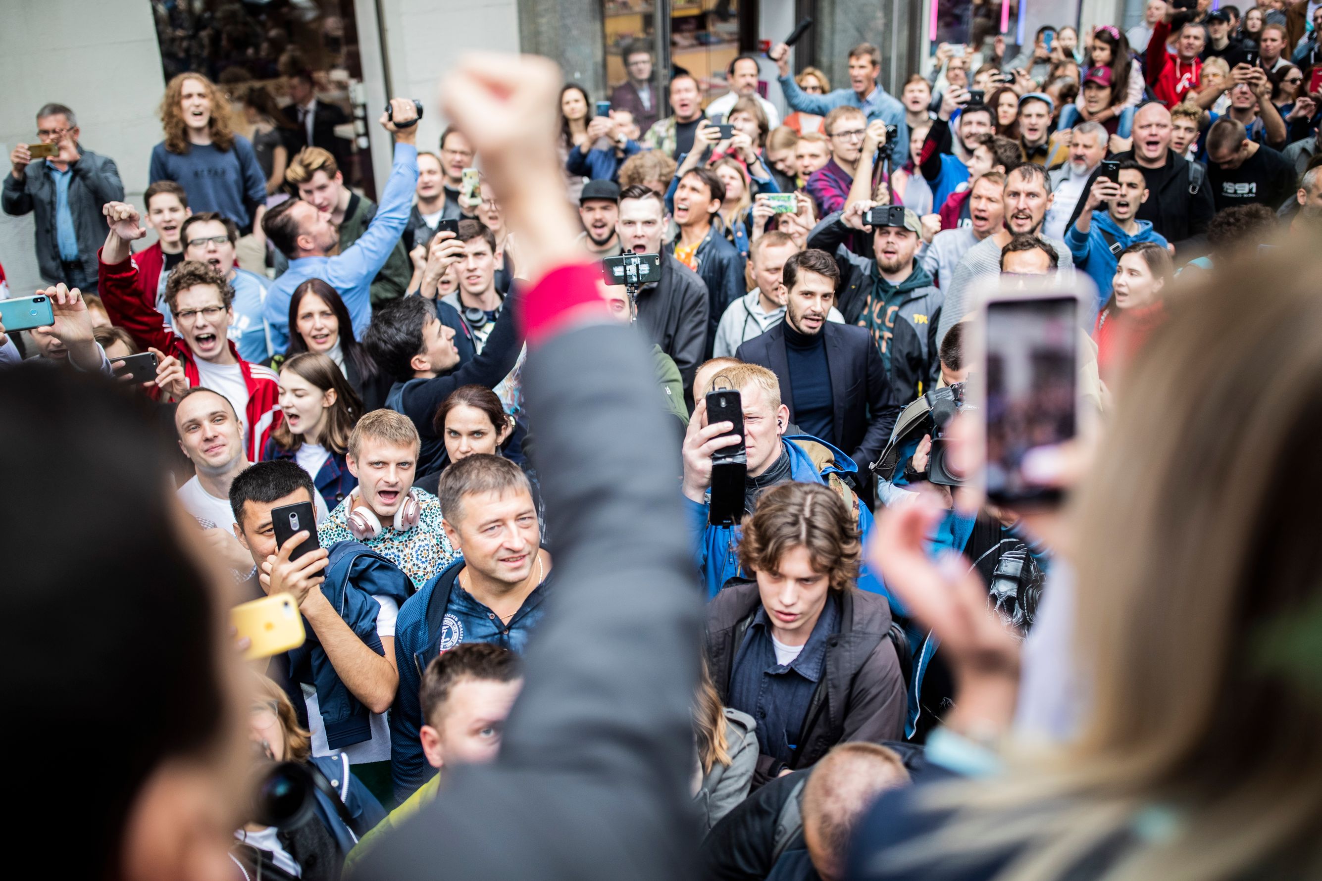 Предложение Соболь услышали не все. Но собравшиеся все равно пошли за кандидатом, многие при этом скандировали: «За Любовь!» и «Регистрируй!»