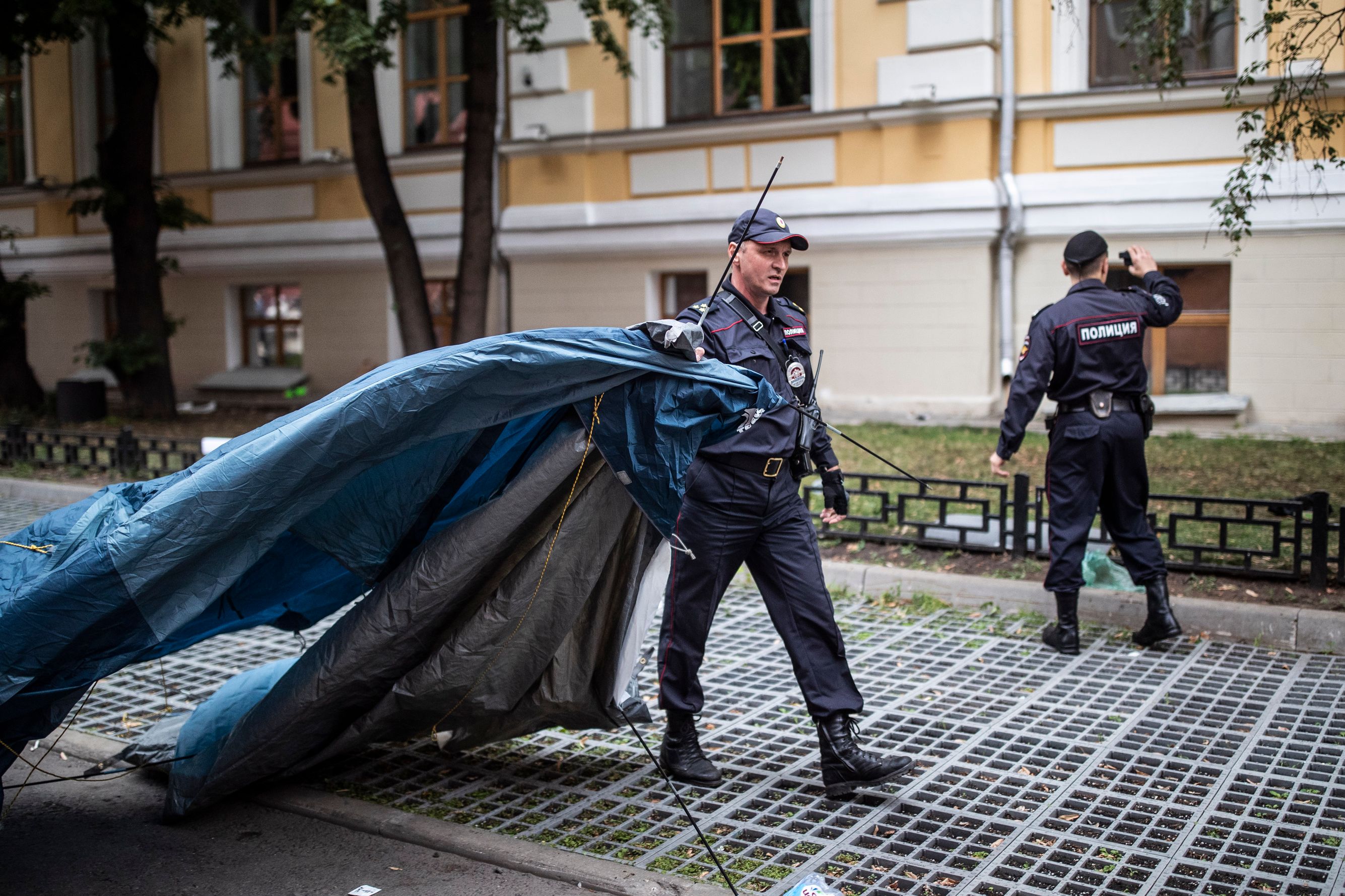 Около 20:00 собравшиеся, до этого сидевшие на ковриках, начали ставить во дворе Мосгоризбиркома палатки. После этого полиция, которая весь день вела себя подчеркнуто сдержанно, начала задержания.