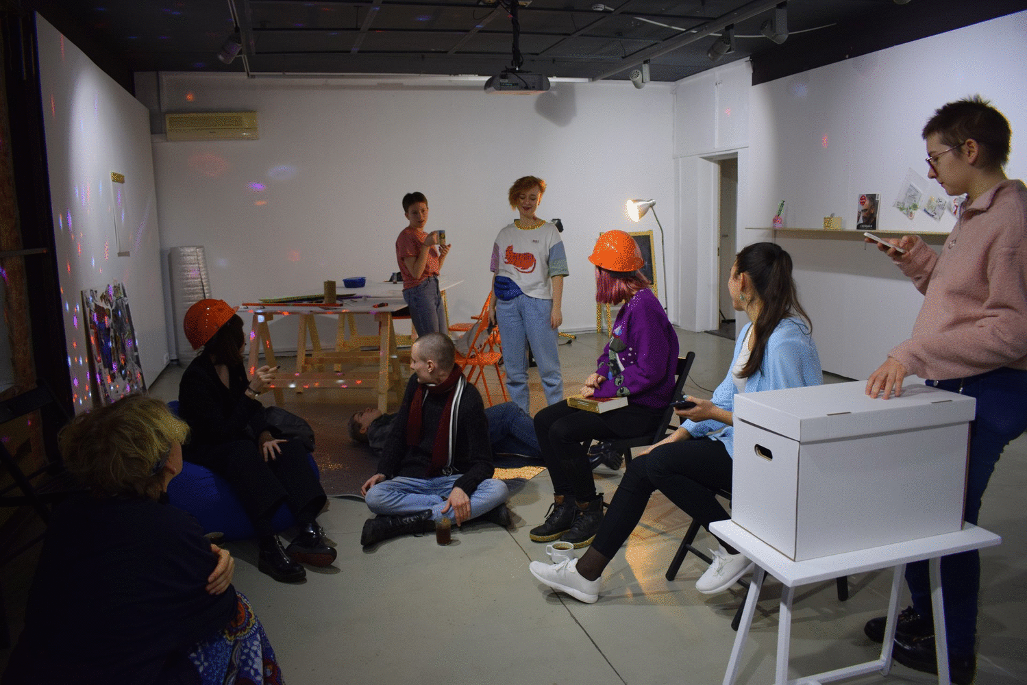 Выставка-лаборатория для подростков «P.S. 18–» (2019). Участни_цы проекта экспонировали свои реди-мейды и провели экскурсию для посетителей, а затем вместе с художницей Соней Ванеян обустроили свое рабочее/выставочное пространство на ближайший месяц