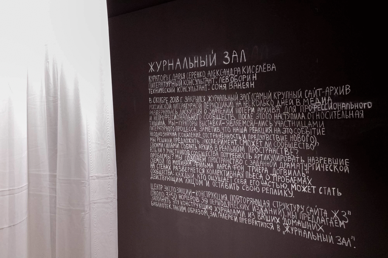 Выставка «Журнальный зал» (2018). Приуроченная к закрытию проекта «Журнальный зал», выставка выстроилась вокруг декорации, напоминающей «Догвилль» Ларса фон Триера. Реплики, оставленные зрителями в ее стенах, сложились в коллективную пьесу о проблемах литературного сообщества