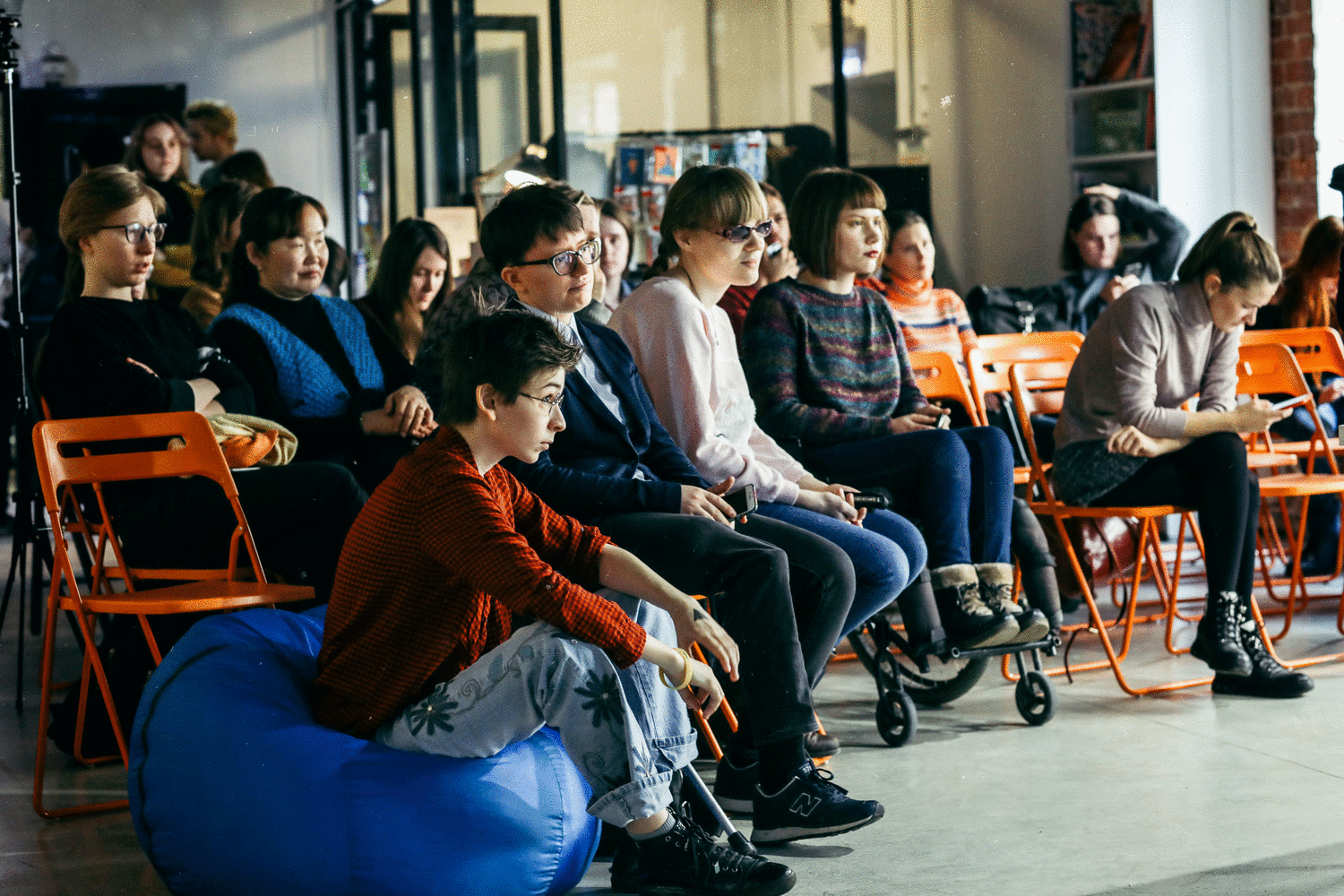 Серенко: Другим примером является прошедший в наших стенах фестиваль «Женщины. Инвалидность. Феминизм», и мне кажется, что ни в одном учреждении культуры за последнее время не было столько говорящих о себе и за себя людей с инвалидностью. Мы сразу проверили наше пространство на всяческую его доступность: хорошо, что мы располагаемся на первом этаже, например. Это был очень важный пространственный опыт: мы смотрели, как живут в нем люди, у которых другая физическая реальность (люди в колясках, люди с белыми палочками, люди как с невидимой, так и с видимой инвалидностью), это требовало постоянной организаторской чуткости. Это была попытка прожить хотя бы один день максимально инклюзивно.