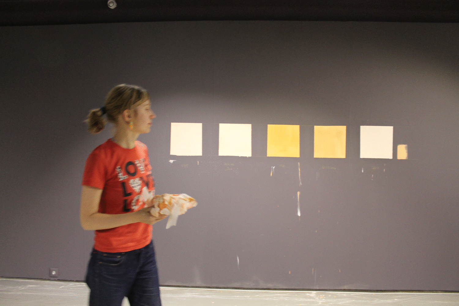 Ольга Машинец. Объем работ (2019). В перформансе «Объем работ» художница Ольга Машинец на протяжении трех дней самостоятельно проводила монтаж в выставочном пространстве и на этапе каждого действия ставила вопрос о его статусе