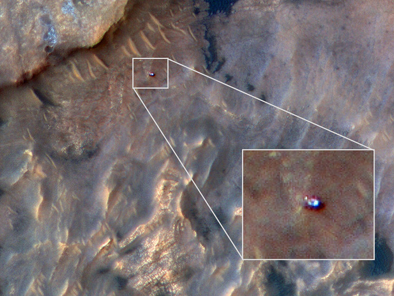 Национальное управление по аэронавтике и исследованию космического пространства (NASA) опубликовало сделанный с орбиты Марса снимок, на котором запечатлен марсоход Curiosity.