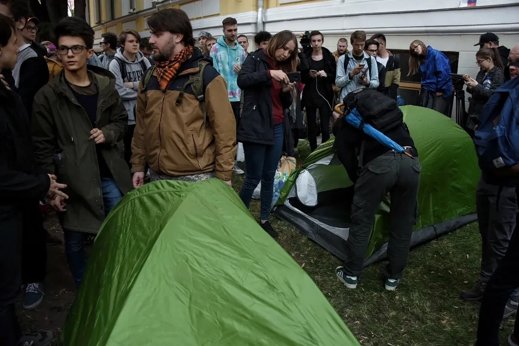 Соболь собирается остаться на ночь у здания, чтобы лично встретиться с Горбуновым, как только он приедет на работу в понедельник. Другие кандидаты просят оставшихся людей привозить еще походные пенки, воду, еду. Во двор в какой-то момент даже привезли туалетные кабинки, но непонятно, заказал ли их кто-то именно для протестующих. Люди предлагают друг другу «пауэрбанки» для зарядки телефонов. У выхода из дворов на Моховую стоит восемь автозаков, а рядом с протестующими стоят и пока улыбаются сотрудники туристической полиции.