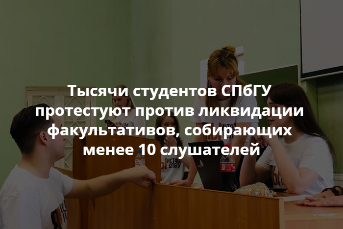 В апреле СПбГУ издал приказ, который устраняет факультативные и элективные дисциплины, собирающие менее десяти слушателей. Против этого выступили тысячи студентов: они подписывают петиции, обращаются к Дмитрию Медведеву и выходят на пикеты. Студенты считают, что приказ помешает им получить специализированное образование, и связывают с ним уход многих преподавателей.
