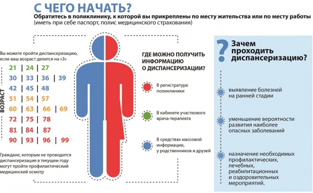 Осмотр проводится за два визита в поликлинике по месту прикрепления. Сначала необходимо сдать ряд анализов, затем прийти на прием (осмотр) врача-терапевта и получить рекомендации. Обратите внимание: в этом случае список анализов, процедур, врачей и указаний по возрасту определен. Так, на диспансеризацию в государственной поликлинике можно рассчитывать раз в три года: когда вам исполняется 21, 24, 27, 30, 33, 36 и т.д.