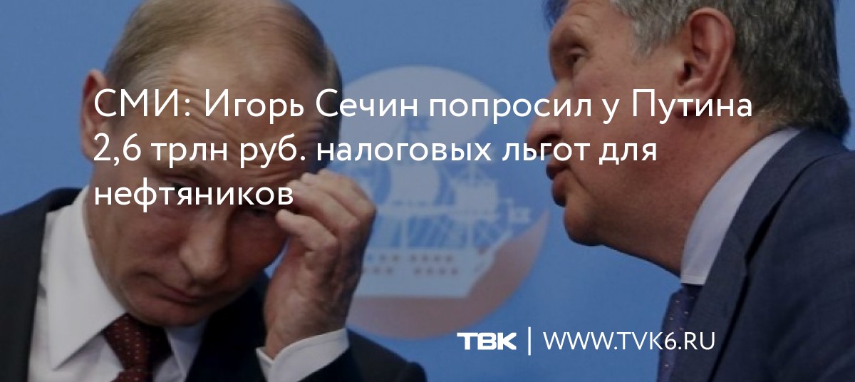 СМИ: Игорь Сечин попросил у Путина 2,6 трлн руб. налоговых льгот для нефтяников