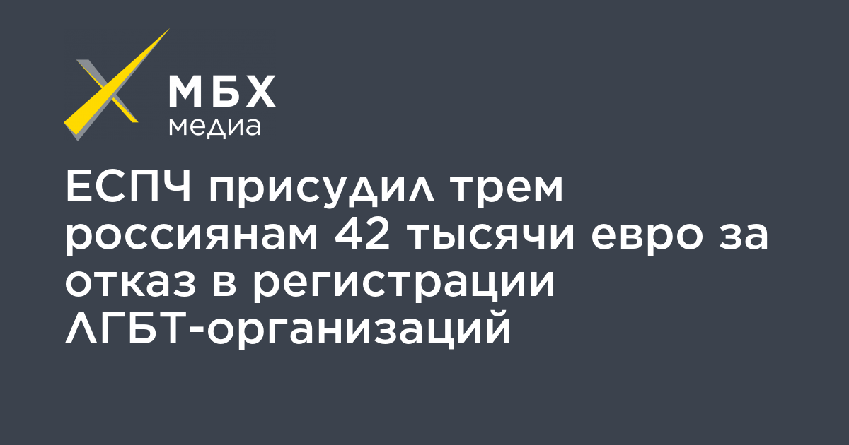 ЕСПЧ присудил в общей сложности 42500 евро трем россиянам, которым власти отказали в регистрации ЛГБТ-НКО. Об этом «МБХ медиа» рассказал активист ЛГБТ-движения Николай Алексеев. «МБХ медиа» также обнаружило решение на сайте Старсбургского суда.