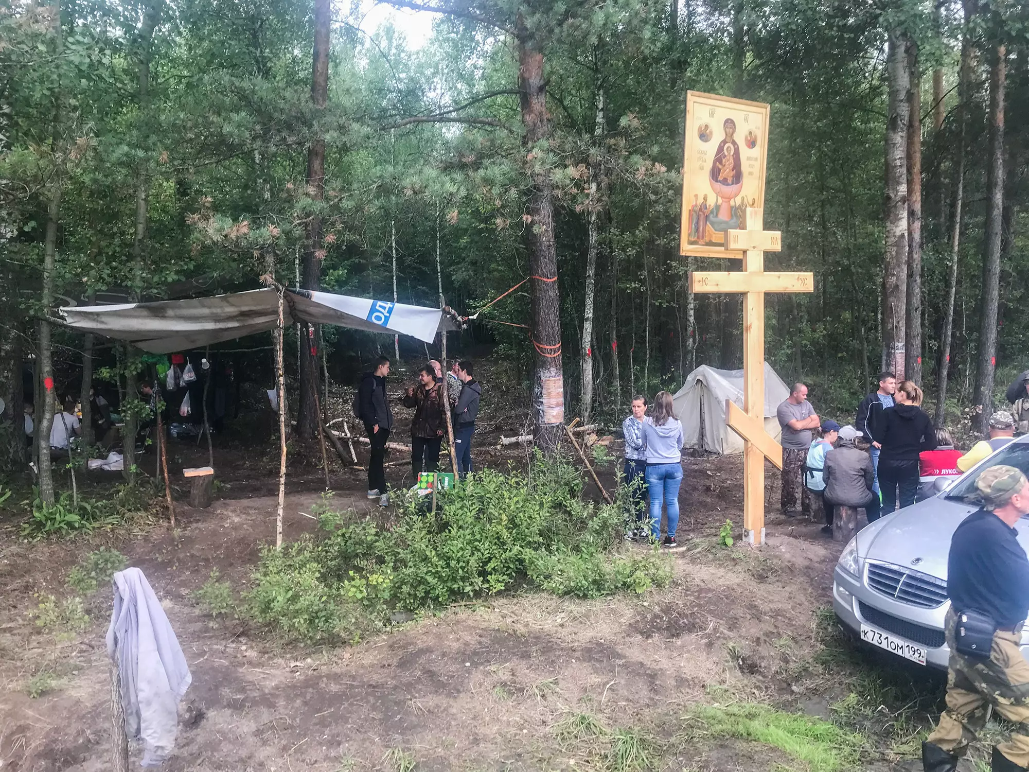 Почти в ста километрах от Москвы на обочине федеральной трассы А-108 стоит православный трехметровый деревянный крест. Над ним, между двух деревьев висит освященная икона с Богородицей, купающей младенца Иисуса в святом источнике. Они должны защитить леса Ликино-Дулево от вырубки и постройки «мусорного комбината» компанией Хартия, которая принадлежит сыну генпрокурора Чайки Игорю. По крайней мере, в это верят местные жители и активисты, которые разбили небольшой лагерь из палатки и пары самодельных тентов все на той же обочине.