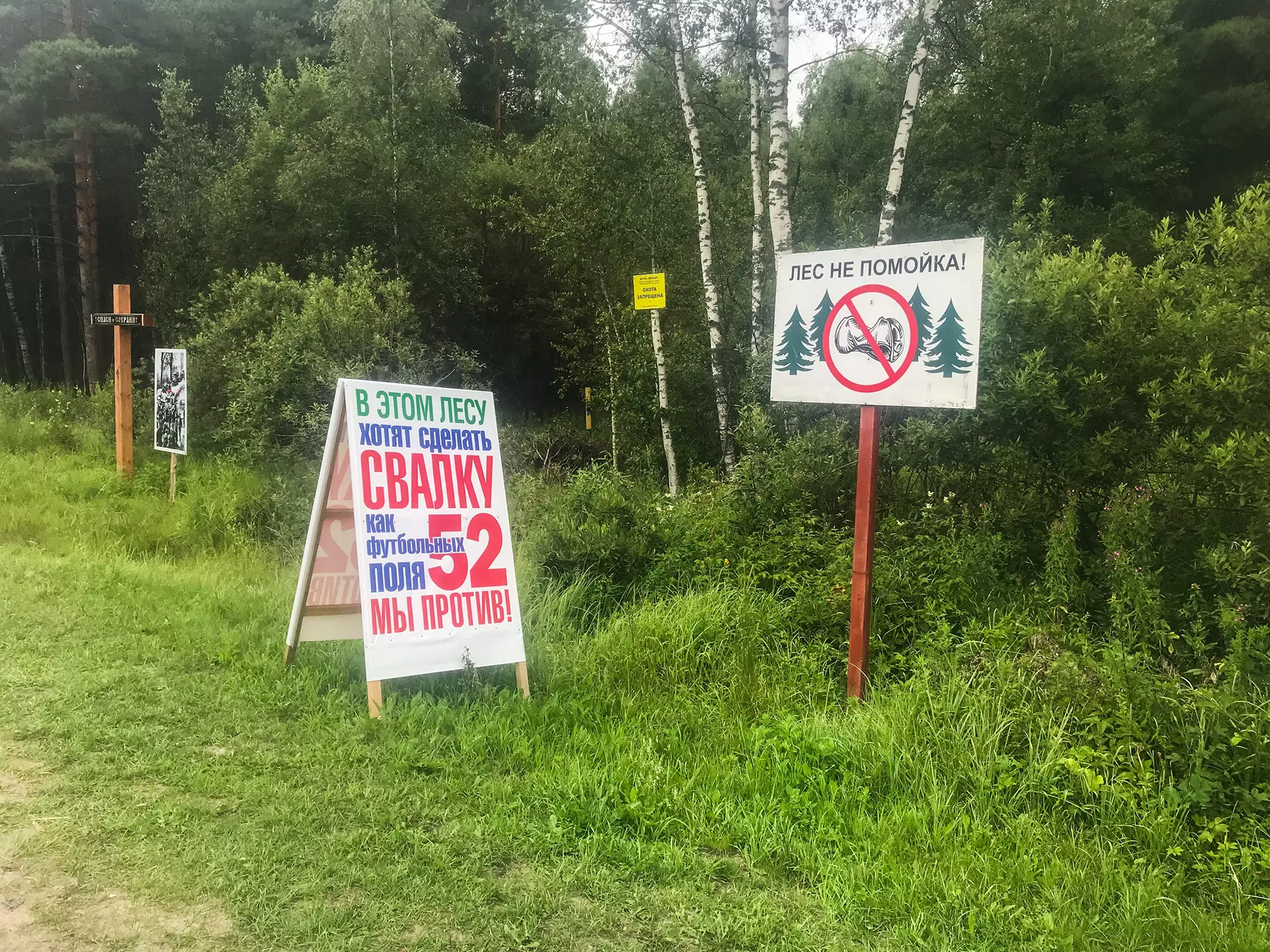 «В этом лесу хотят сделать свалку, как 52 футбольных поля! Мы против!», — встречает подъезжающих к лагерю плакат местных жителей. За ним встроились семь автомобилей ДПС и два белых автобуса без опознавательных знаков. Сквозь щель между рамой и шторой одного из них мелькают люди в полицейской форме.