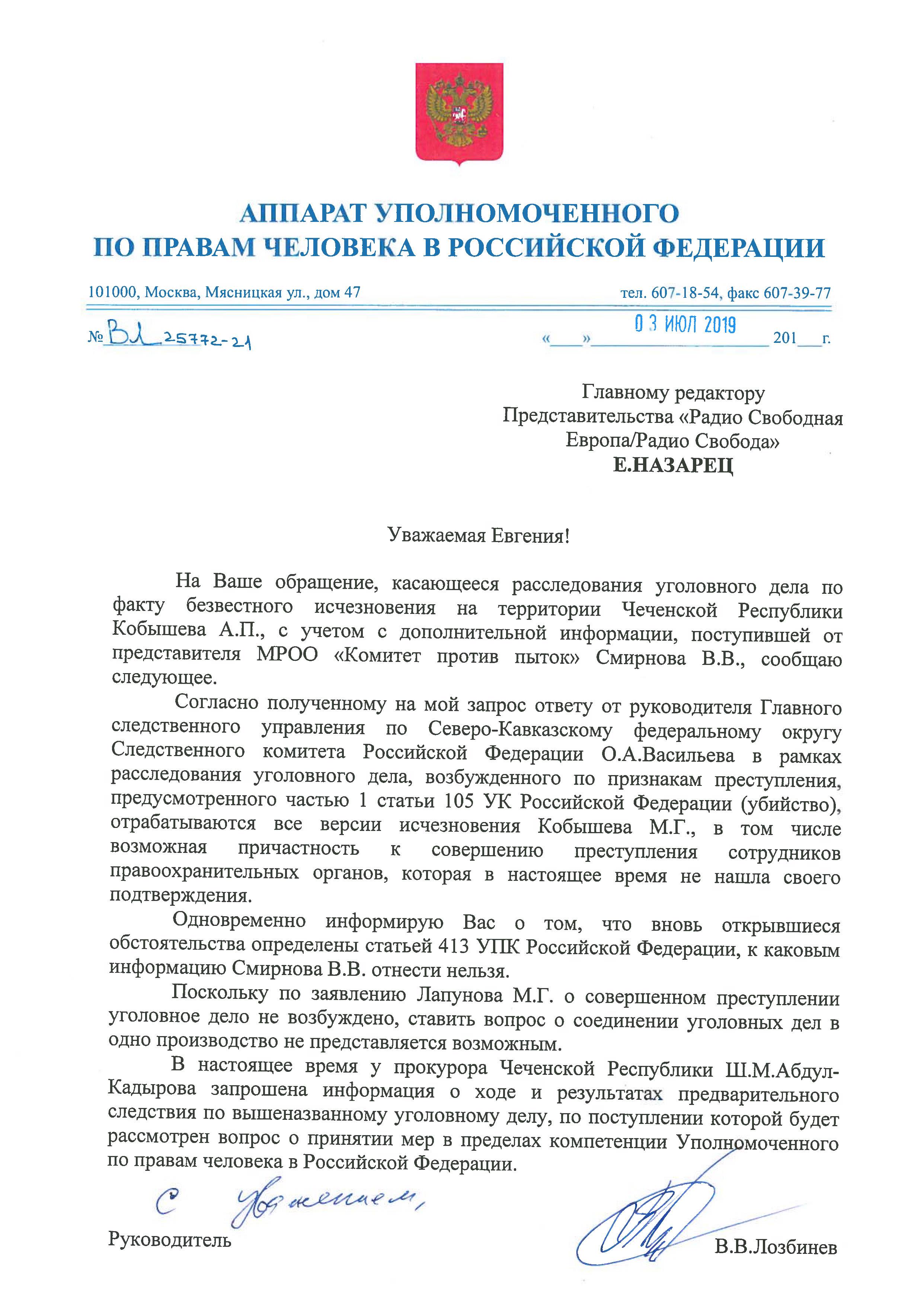 Как пишет руководитель аппарата уполномоченного по правам человека Владимир Лозбинев, версия причастности к пропаже Кобышева сотрудников чеченских правоохранительных органов "в настоящее время не нашла своего подтверждения". Кроме того, и расследование никто, кажется, возобновлять не собирается. По крайней мере аппарат омбудсмена не нашёл оснований для этого в показаниях Максима Лапунова. По заявлению самого Лапунова, уголовное дело также не было возбуждено (сам он уехал за границу), так что соединить уголовные дела Кобышева и Лапунова не получится.