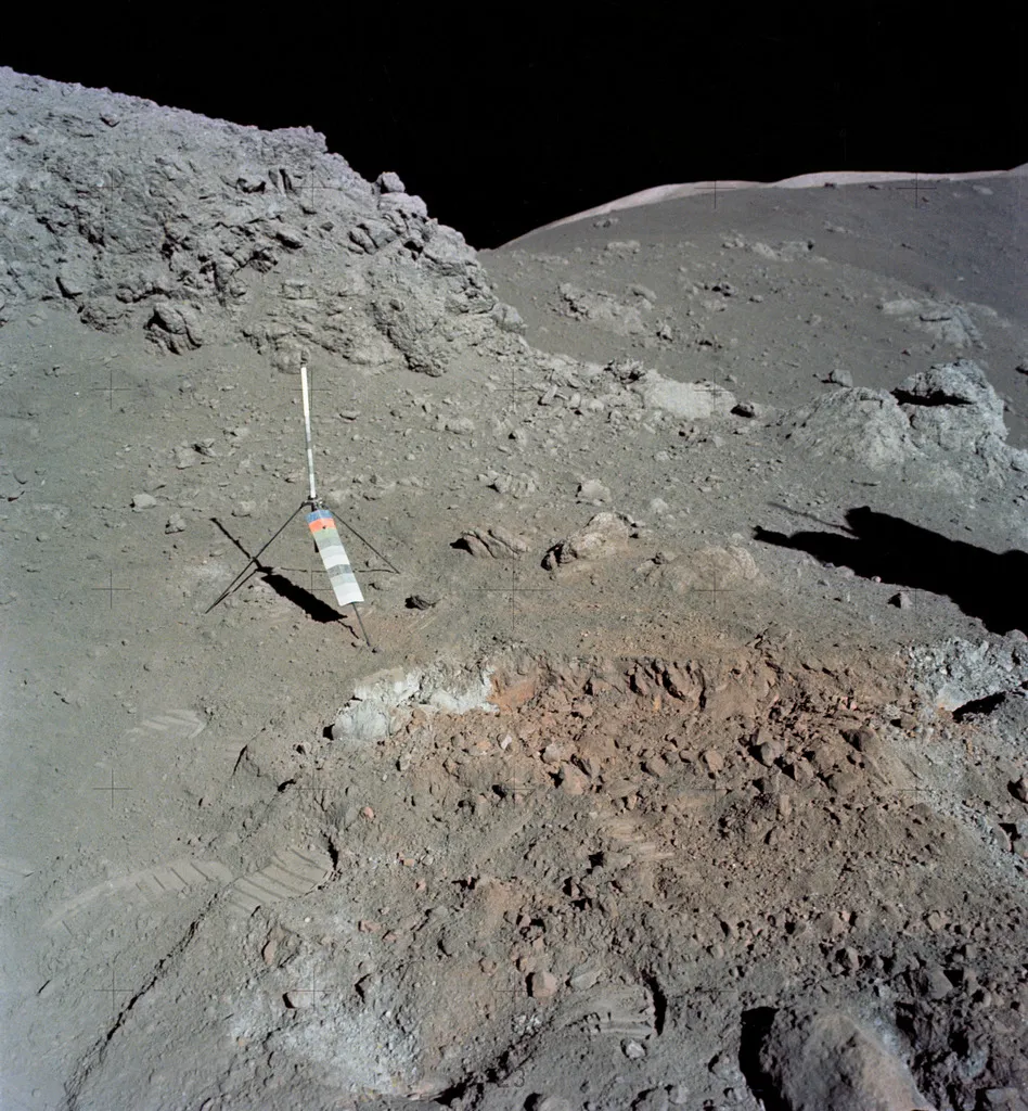 Другим крупным достижением экспедиции «Аполлона-15» стала доставка керна длиной 2,7 м, состоящего из 55 слоев. Его анализ помог воссоздать древнюю историю Луны и Земли. Например, получила подтверждение гипотеза английского астронома Уильяма Маккри, который полагал, что наша планета периодически проходит через облако космической пыли, вызывающее глобальное похолодание. В керне наблюдаются три повторяющихся слоя пыли с интервалами в 100 млн лет, предсказанными Маккри15.
