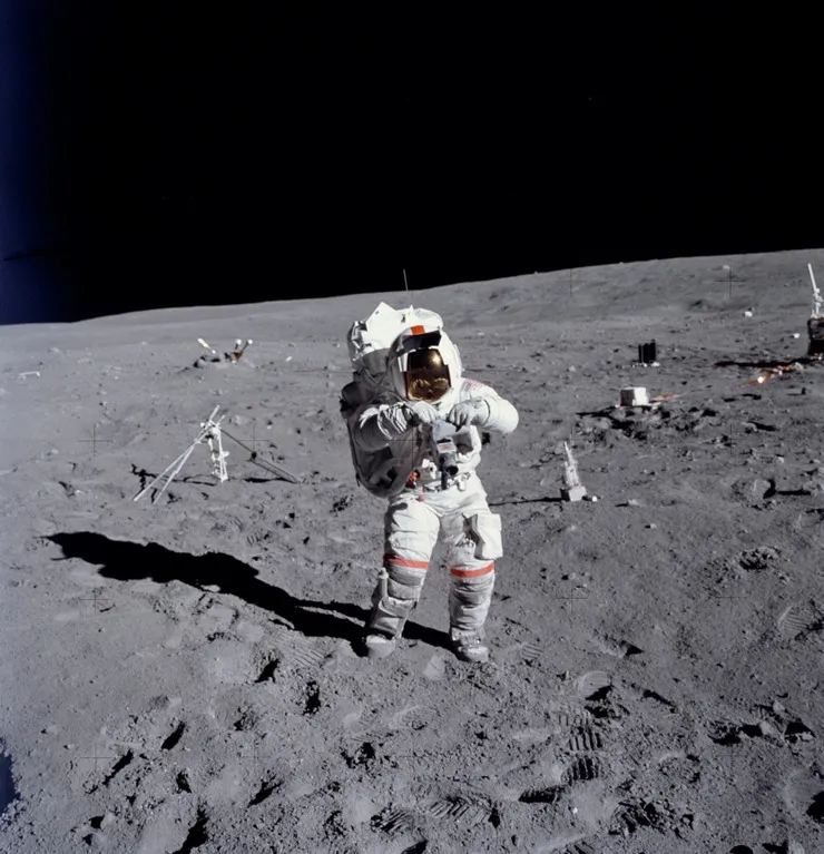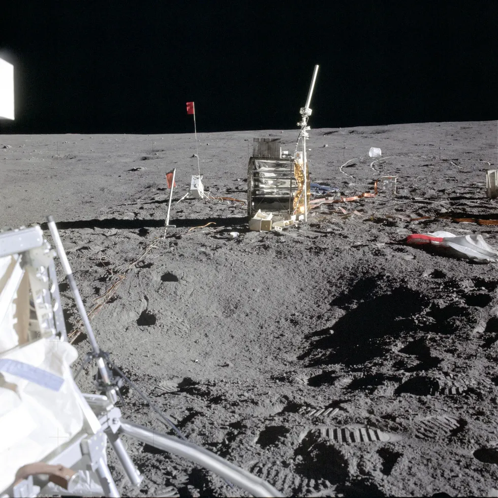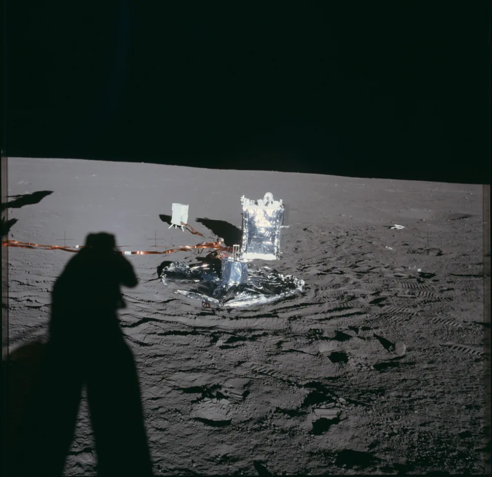 Астронавт Эдвин Олдрин устанавливает сейсмическую станцию PSEP (NASA, AS11-40-5947) Во время вылазки астронавты использовали стереокамеру, которая устанавливалась вертикально и позволяла заснять «девственную» поверхность с очень близкого расстояния. На некоторых снимках запечатлена необычная деталь: пятна тонкого слоя «глазури» на частицах грунта. Астрофизик Томас Голд предположил, что сравнительно недавно (не позднее 100 тыс. лет назад) Луна подверглась внезапному нагреву в результате мощнейшей солнечной вспышки, при которой на полторы минуты радиация возросла на два порядка6.