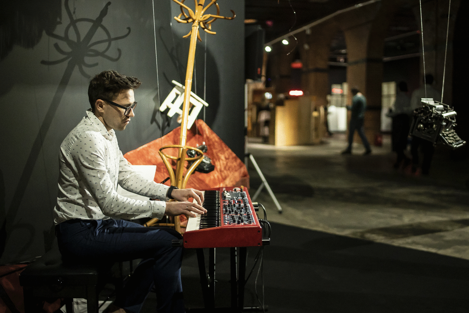 Алина Сапрыкина на фоне центральной инсталляции выставки «Мода и революция» (2017); посетительница выставки «Любимов и время» и иммерсивного спектакля Максима Диденко «Десять дней, которые потрясли мир» (2017); концерт на финисаже выставки «Сны Москвы» (2019)