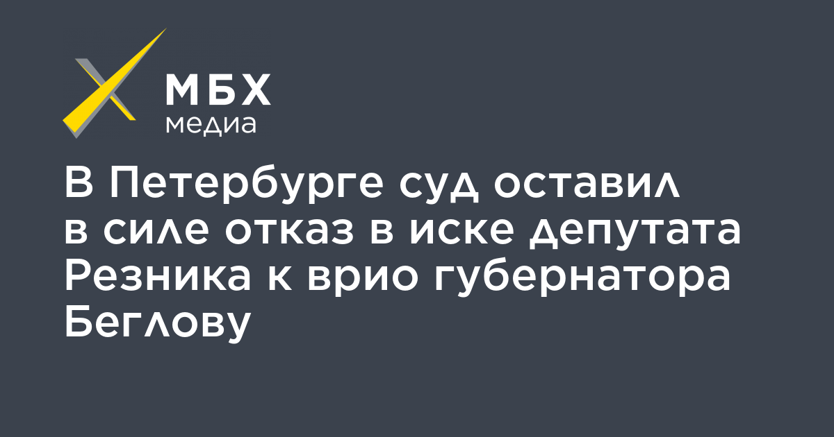 Санкт-Петербургский городской суд отклонил апелляцию на отказ в иске депутата Заксобрания Максима Резника к врио губернатора города Александру Беглову о защите чести и достоинства, сообщает корреспондент «МБХ медиа».