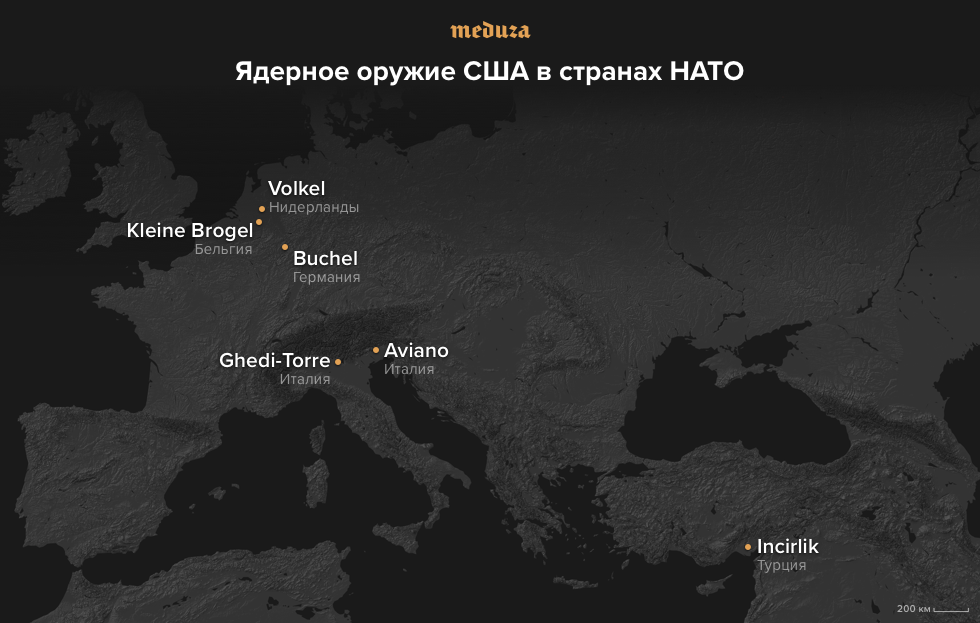 Ядерное оружие США в Европе, предположительно, размещено на военных базах в Бельгии, Германии, Нидерландах, Италии и Турции. Об их расположении случайно стало известно из доклада канадского сенатора, члена Комитета по обороне и безопасности Парламентской ассамблеи НАТО Джозефа Дея, сообщает бельгийское издание De Morgen.