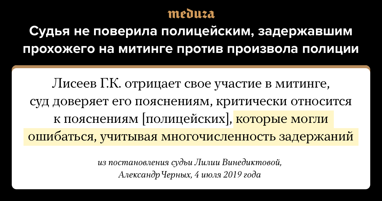 После марша против полицейского произвола 12 июня 2019 года судья Головинского районного суда Москвы Лилия Винедиктова отказалась наказывать троих задержанных на акции. В решении она указала, что полицейские «могли ошибаться», утверждая, что задержанные участвовали в марше.