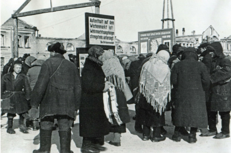 Рынок в Смоленске. Надпись на плакате: "Военнослужащим вермахта вход на рынок строжайше запрещен". Фото из коллекции И.А. Трапезникова предоставлено составителем книги.
