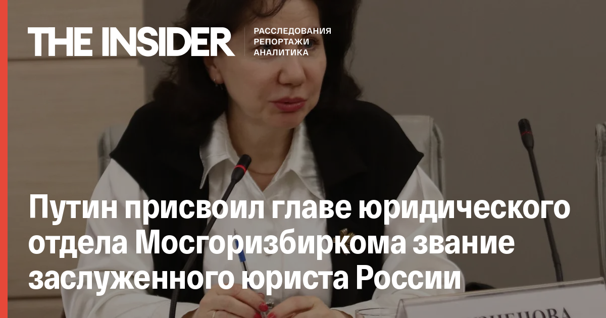Президент Владимир Путин присвоил звание заслуженного юриста России начальнице юридического отдела Мосгоризбиркома Риме Кузнецовой. Соответствующий указ опубликован на официальном портале правовой информации. На это обратила внимание «Медиазона».