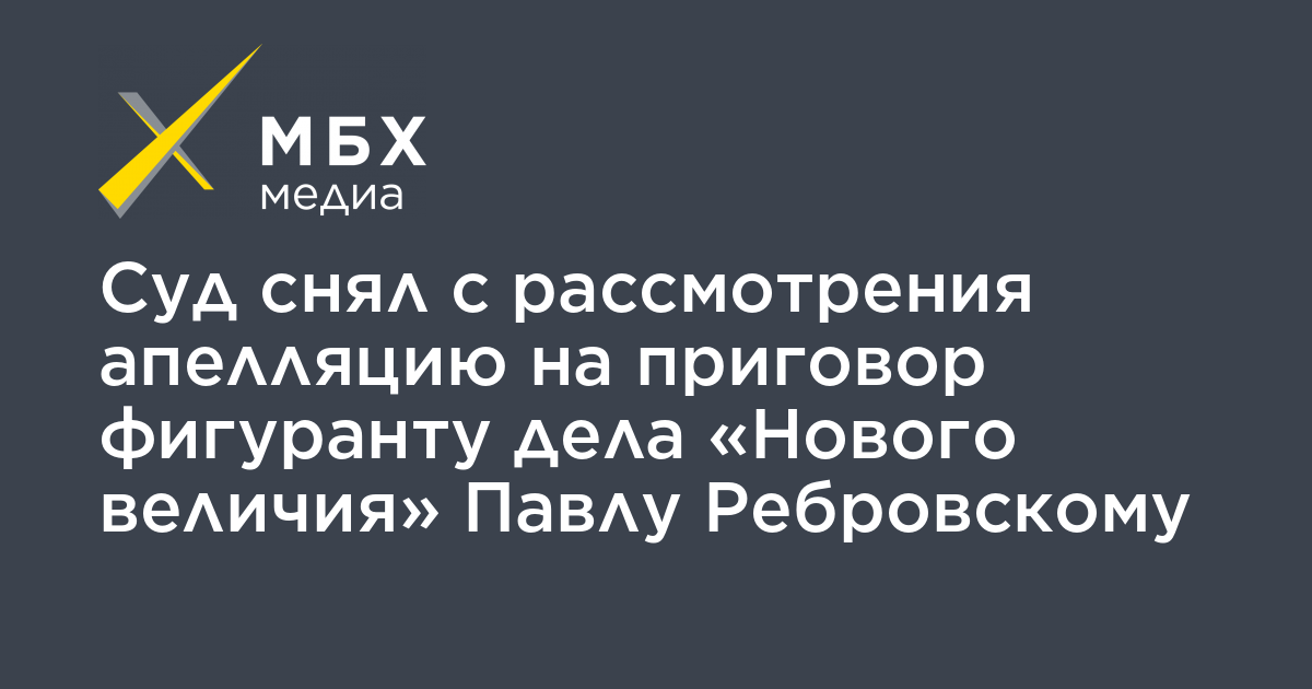 Московский городской суд снял с рассмотрения апелляцию на приговор фигуранту дела «Нового величия» Павлу Ребровскому, который ранее заключил сделку со следствием, а затем отказался от своих показаний. Об этом сообщает корреспондент «МБХ медиа».